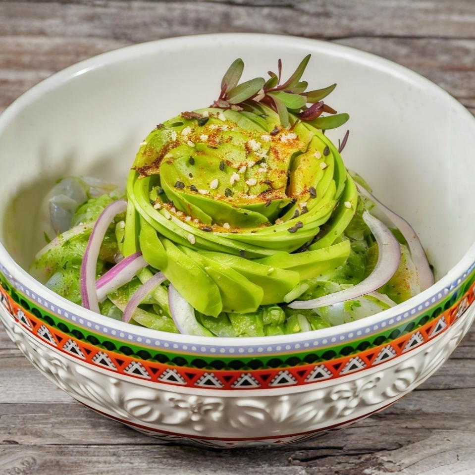 Aguachile de camarón fresco. Con aguacate, láminas de pepino, cebolla morada y furikake.