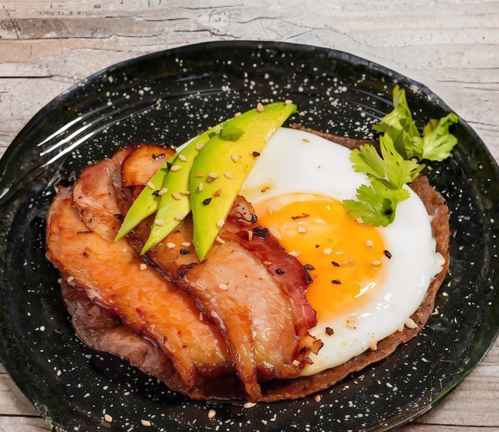 Taco de maíz azul con pork belly ahumado y un huevo frito por encima. Acompañado con una salsa de chile morita con piloncillo
