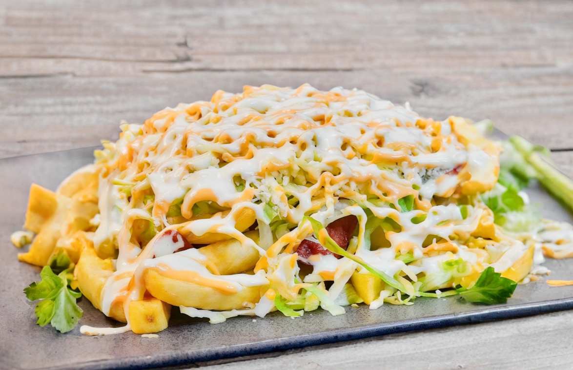 250 grs de papas fritas, salchicha,, tocino, granos de elote, trozos de piña ,lechuga , queso mozarella