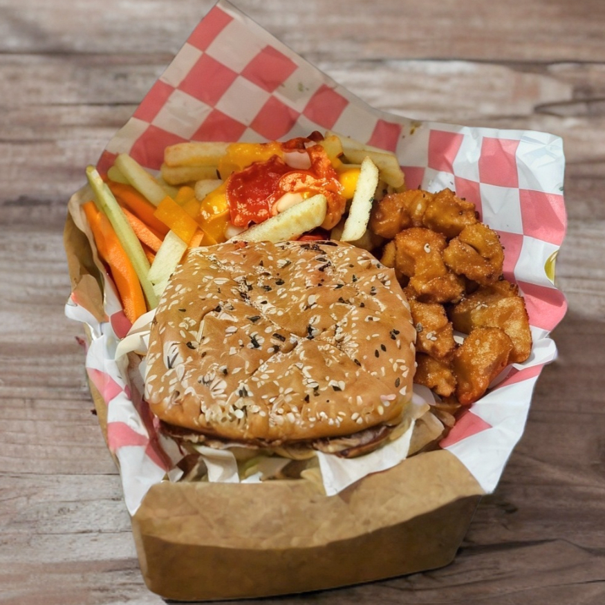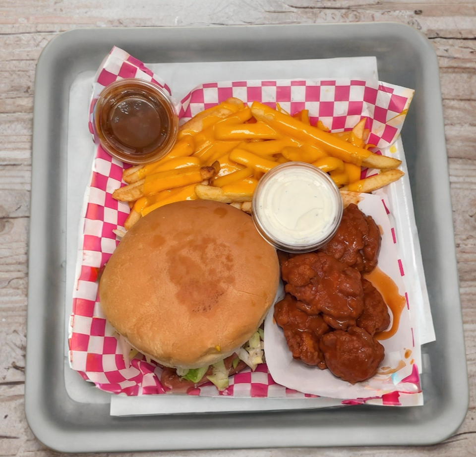 FAMOUS BURGUER*1 + Papas Nachos Hot*1 + 4 unds de boneles en salsa bufalo