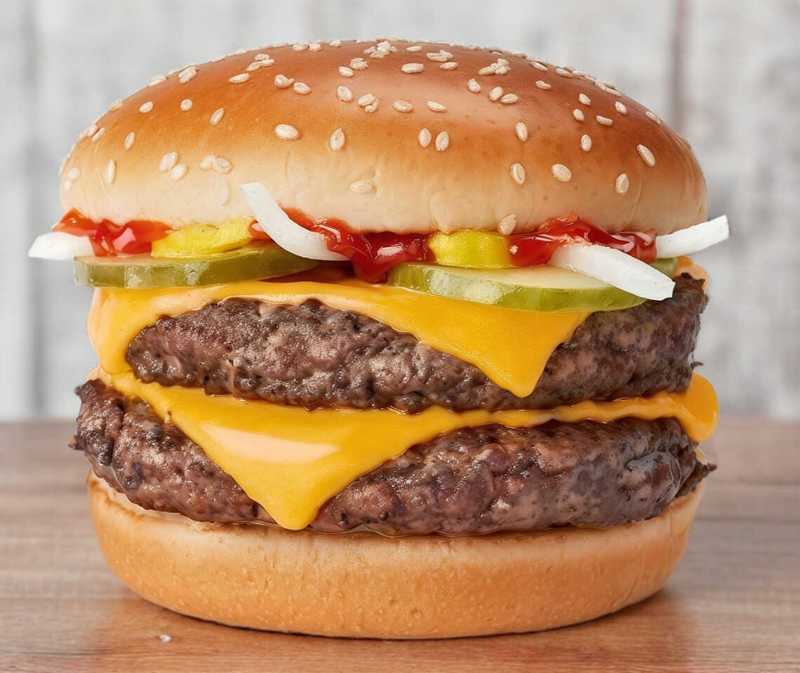 Doble carne, pan brioche con ajonjolu, jamon, queso, aderezo especial, rodaja de tomate, cebolla y lechuga