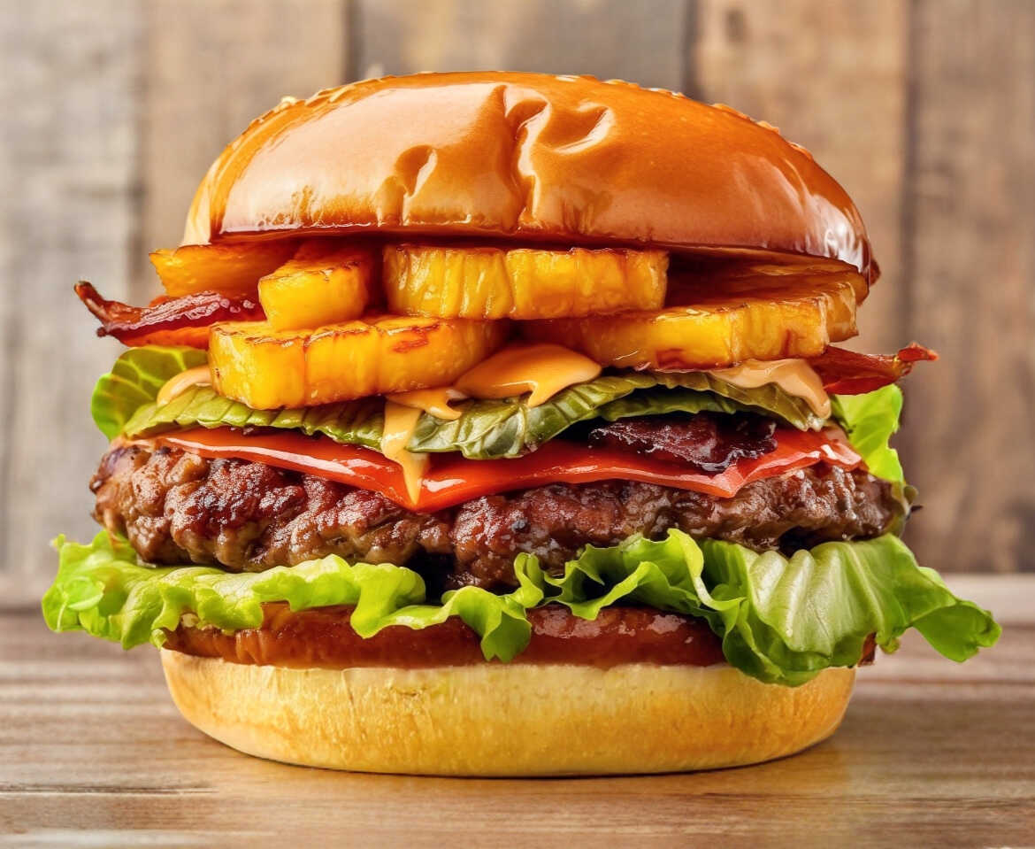 Carne de re, pan brioche. Tocino, rodaja de piña en salsa tiriyaqui, jamon, quezo , aderexos y. Vegetales