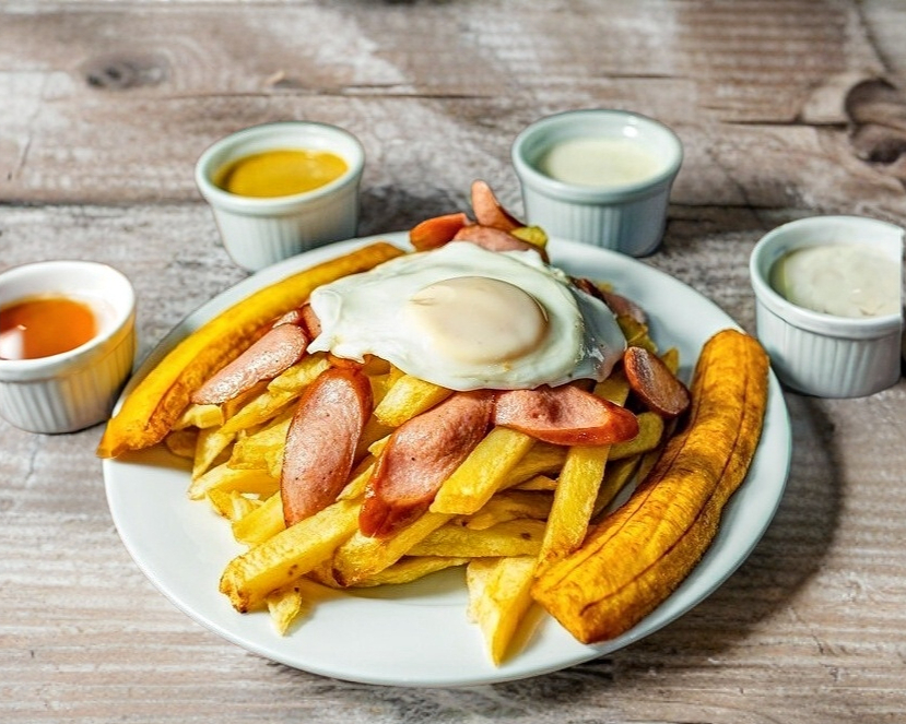 Papas fritas 250 grs, lamina de platano y huevo friyo, salchicha rokefort y ensalada