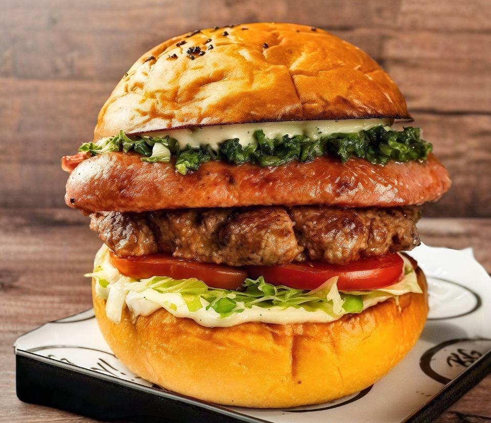 Pan brioche, carne de rez, pollo crujiente, salchicha, aconpañado de tocino lamina, aderezos jamon, queso y vegetsles