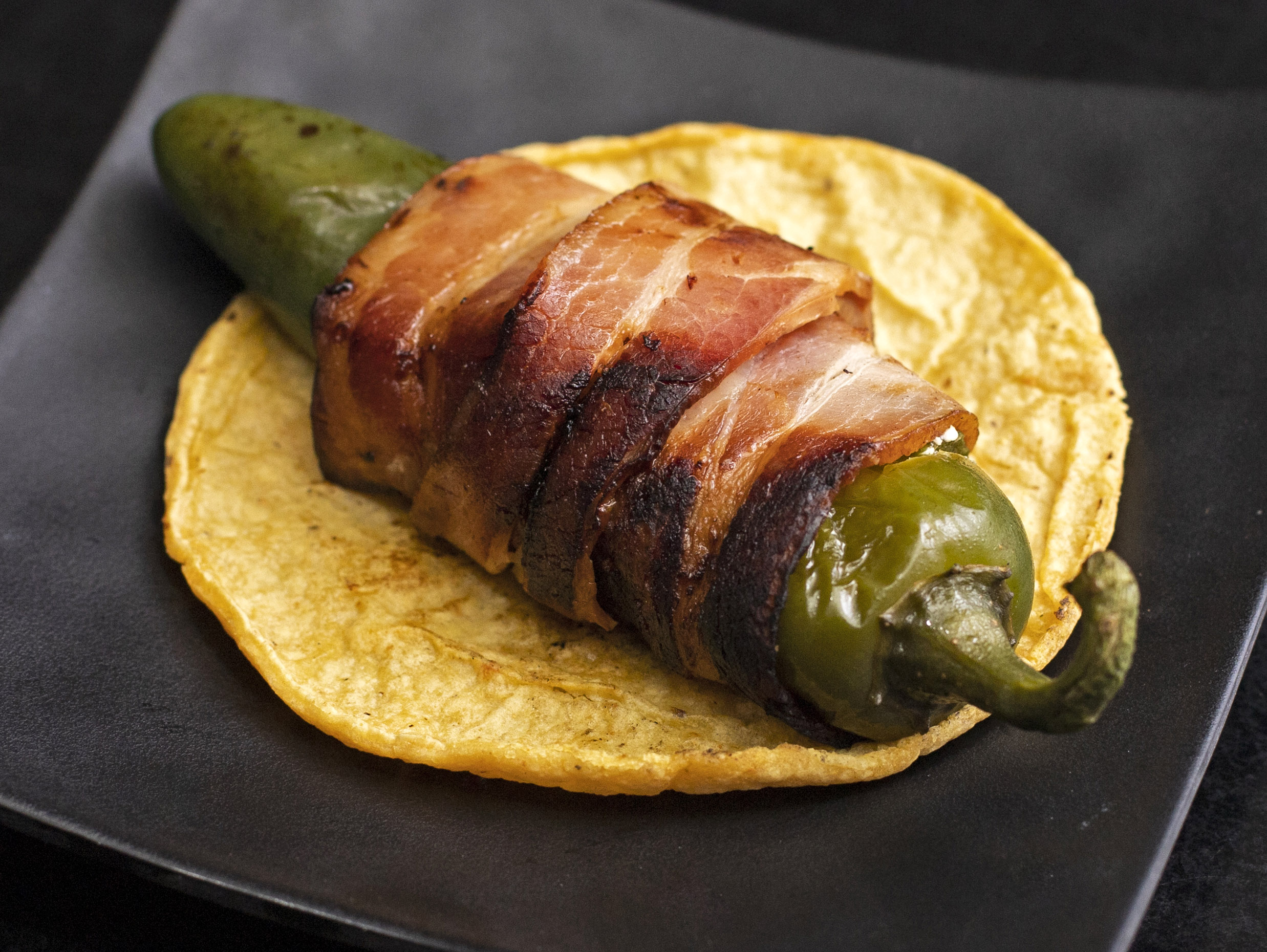 Taquito de chile jalapeño relleno de queso crema envuelto en tocino