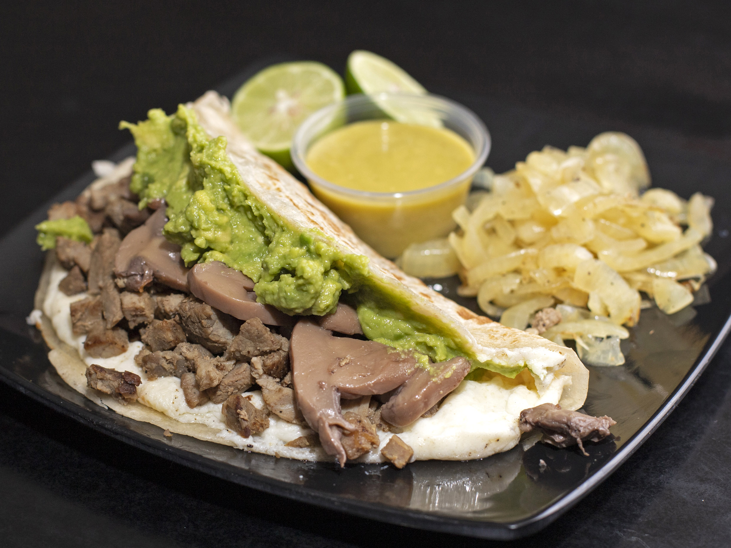 Tortilla blanca tostada a la parrilla con deliciosos frijoles caseros, carne asada, queso asadero y aguacate.