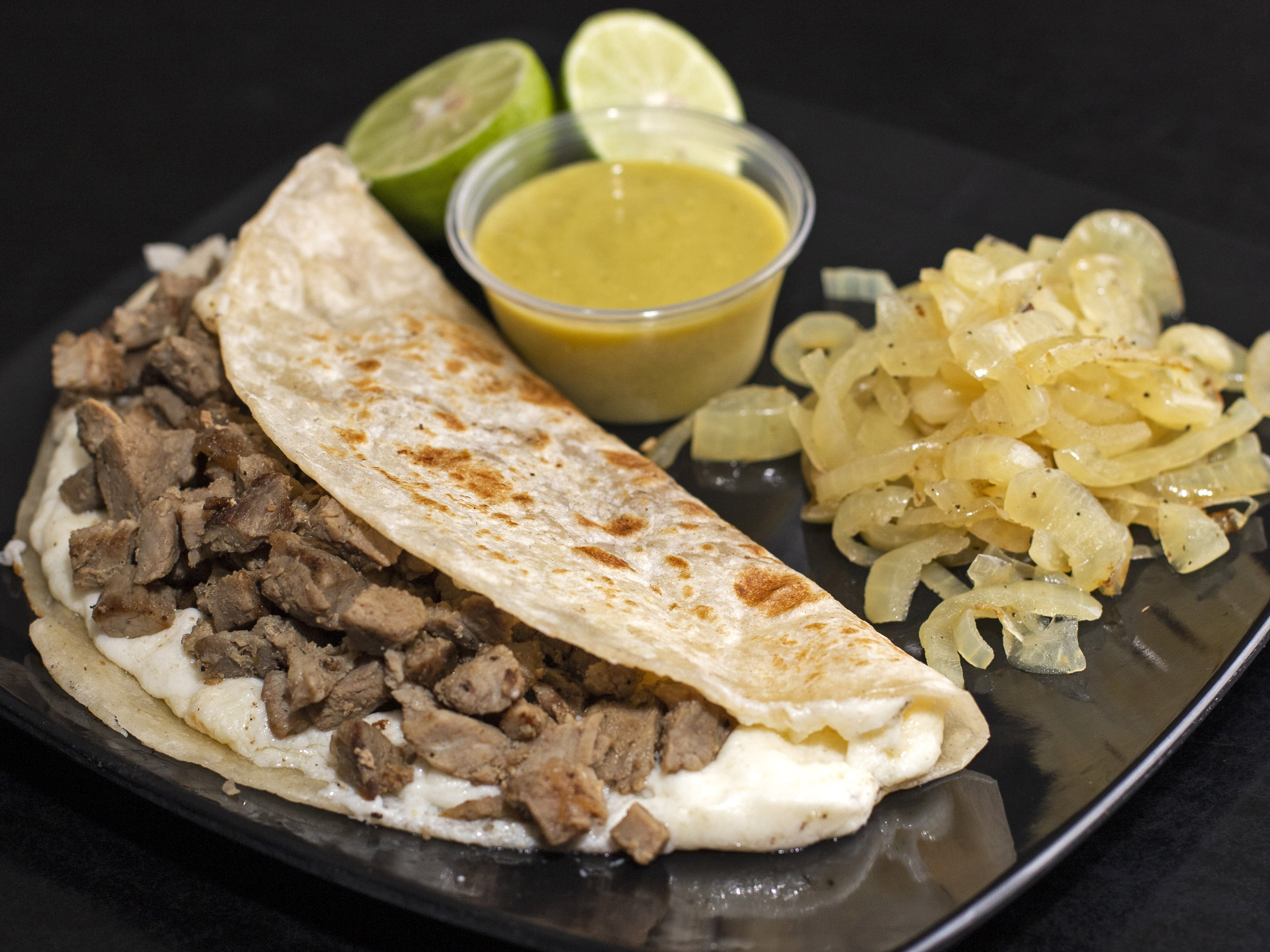 Tortilla grande de harina con queso asadero y carne asada, acompañado de cebolla acitronada, salsa y limón.