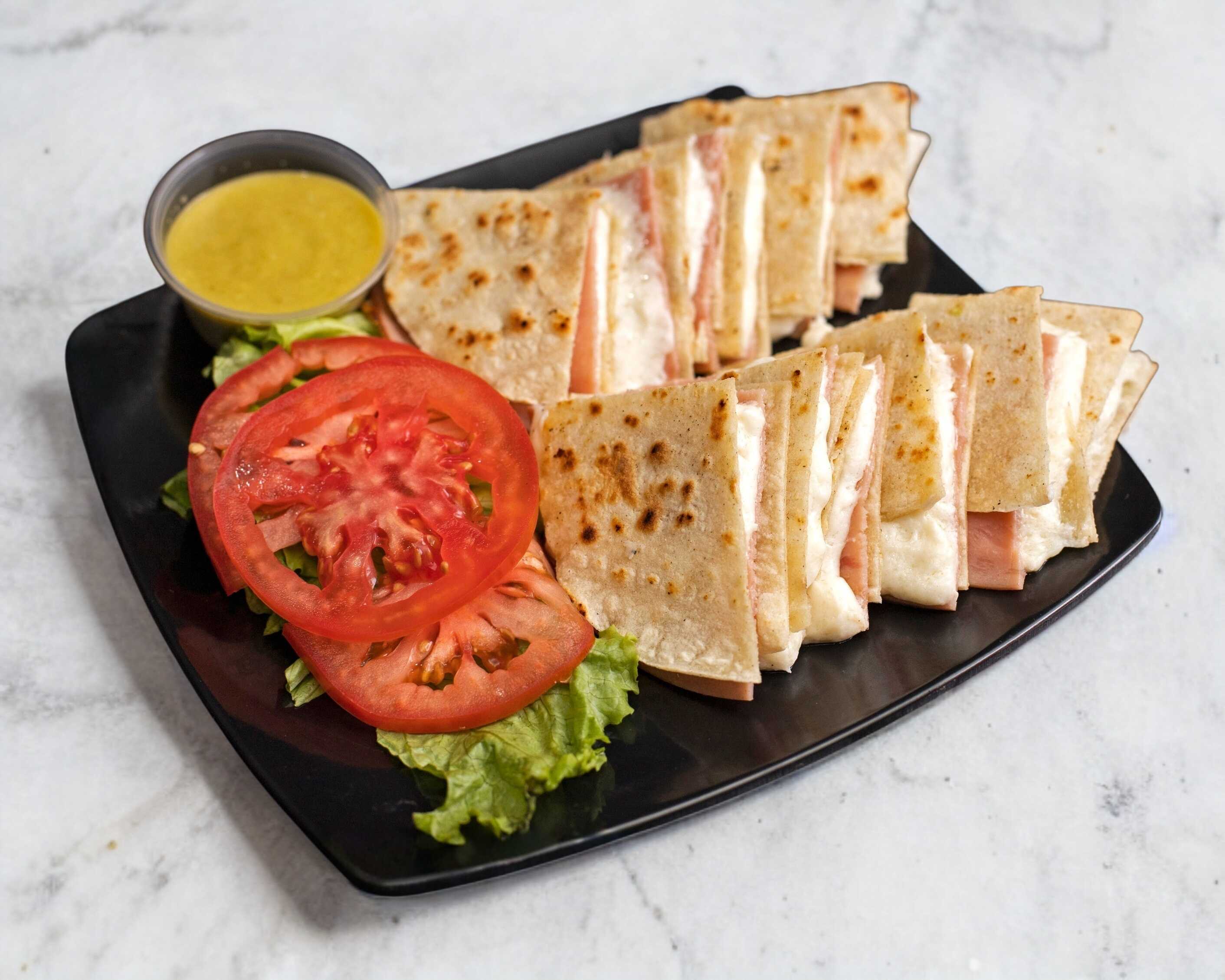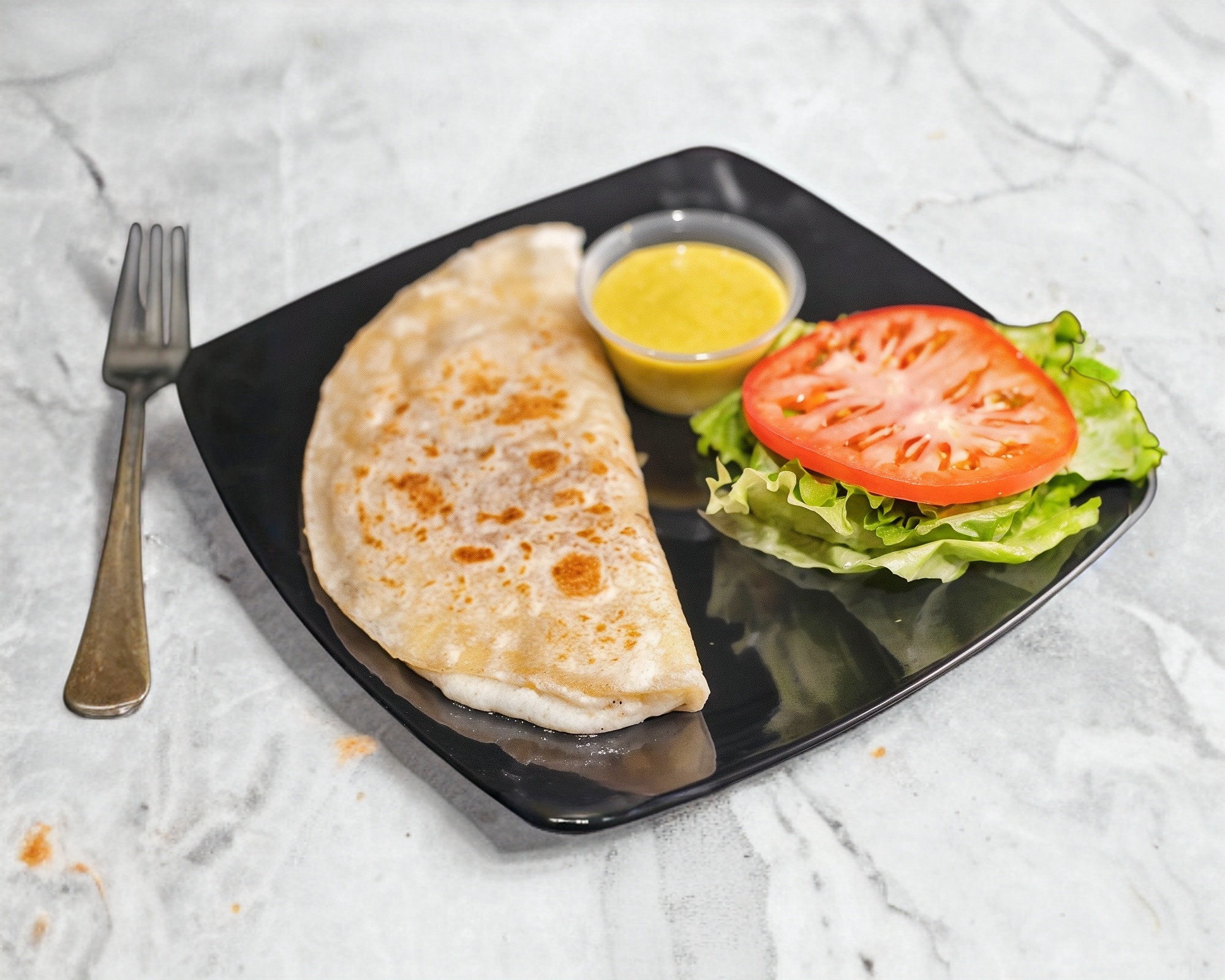 Tortilla de harina grande con queso asadero, acompañado de verduras y salsa.