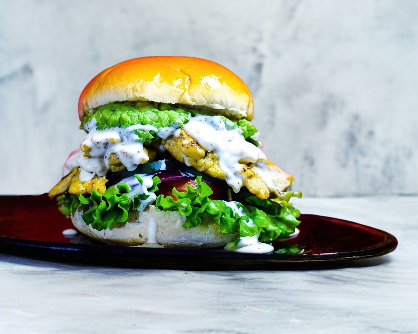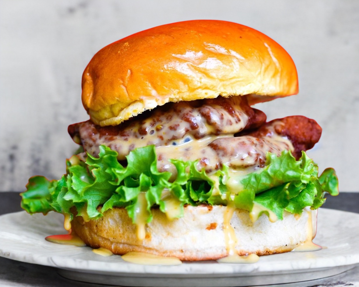 Pan brioche acompañado de un filete de pollo empanizado bañado en aderezo genesis (dulce), lechuga, tomate, cebolla morada y mayonesa