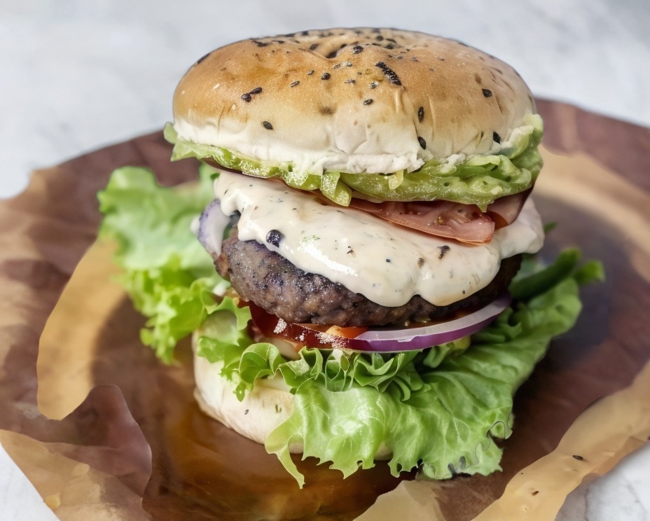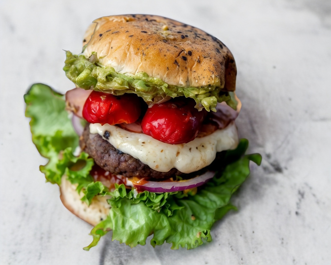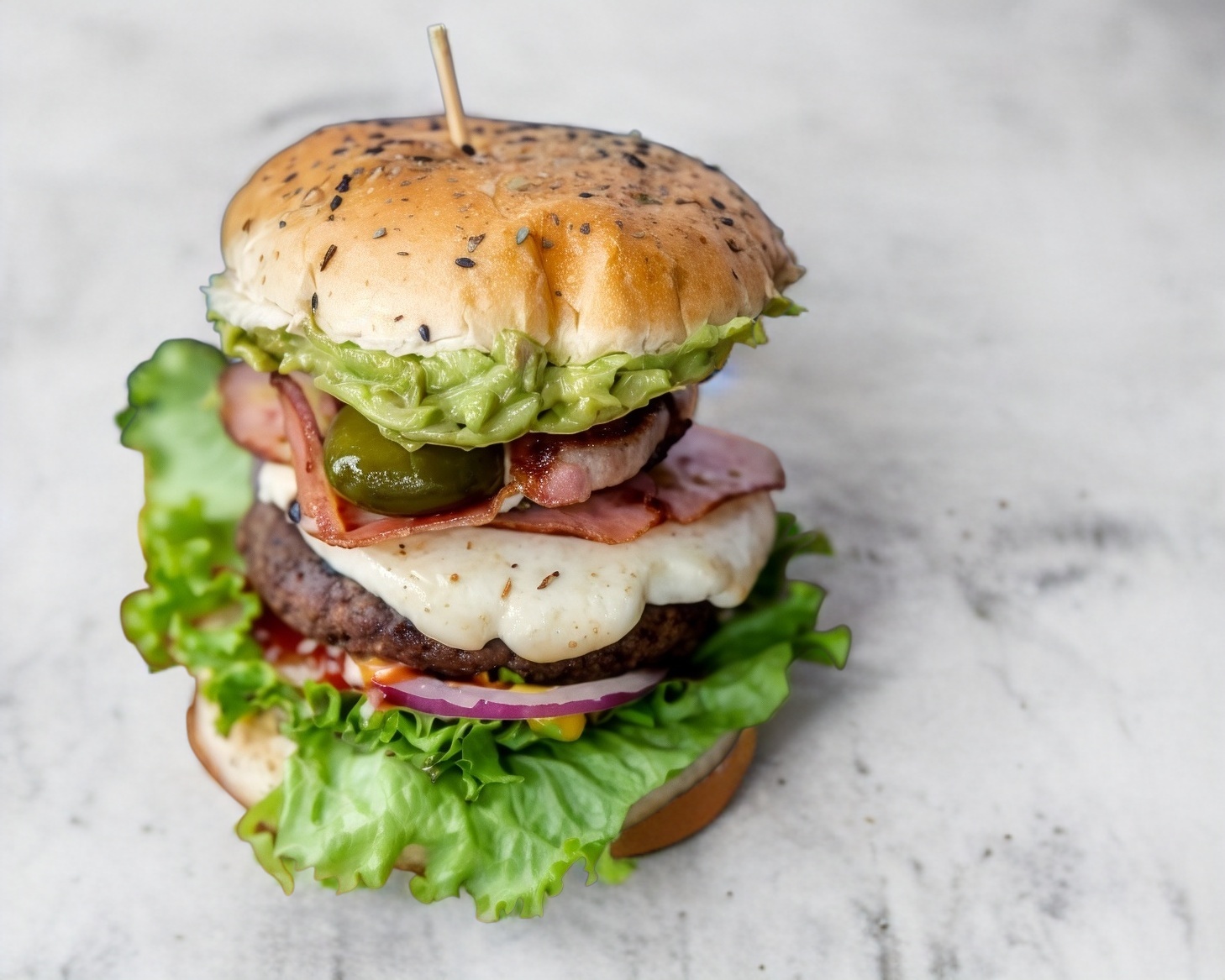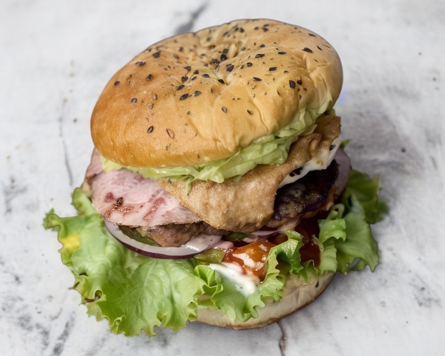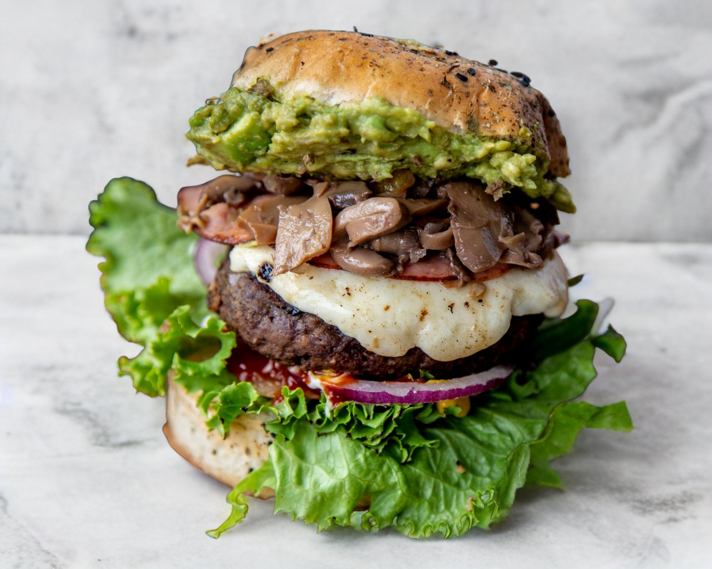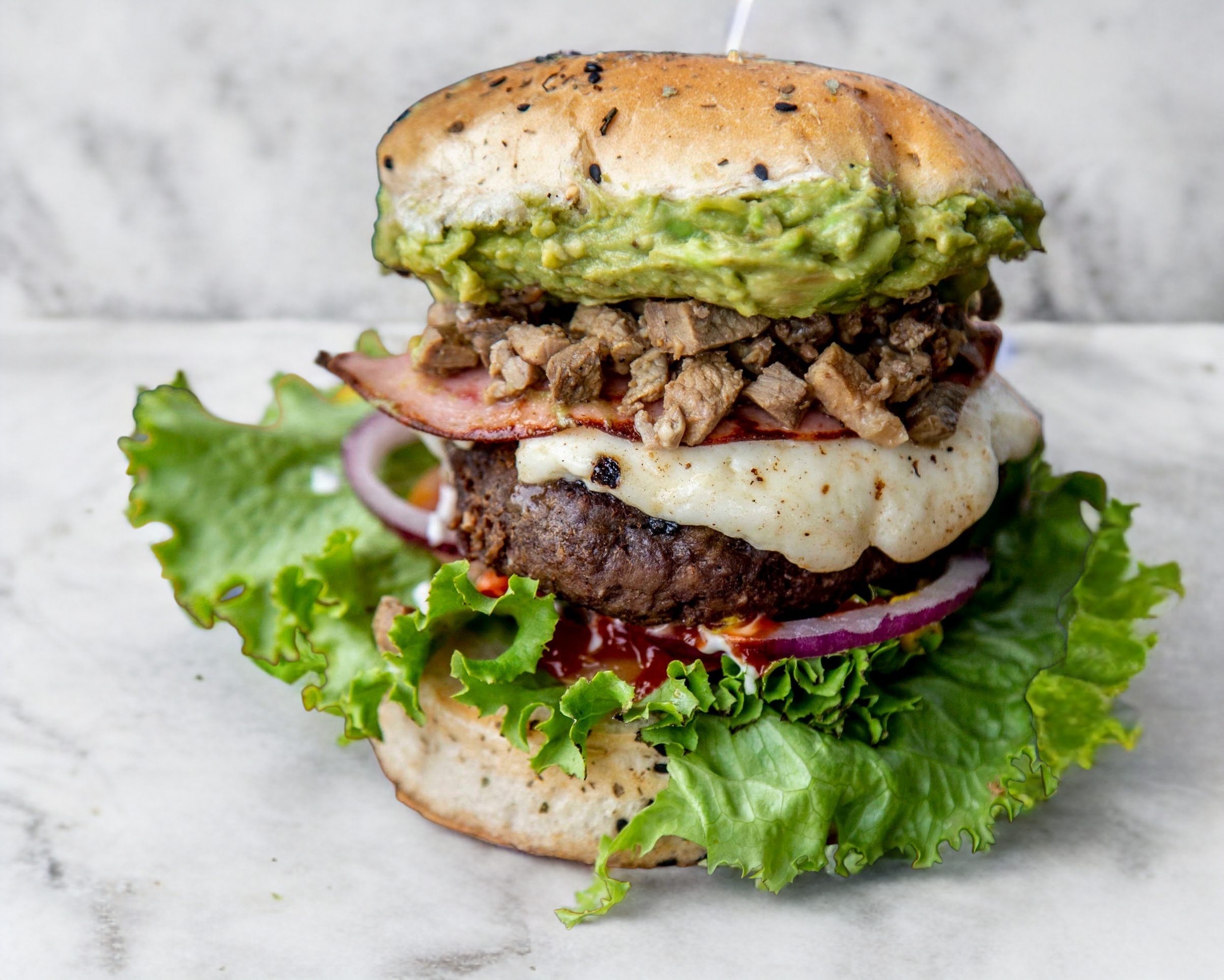 Doble carne casera, doble jamón, doble queso asadero, guacamole, verduras y aderezos.