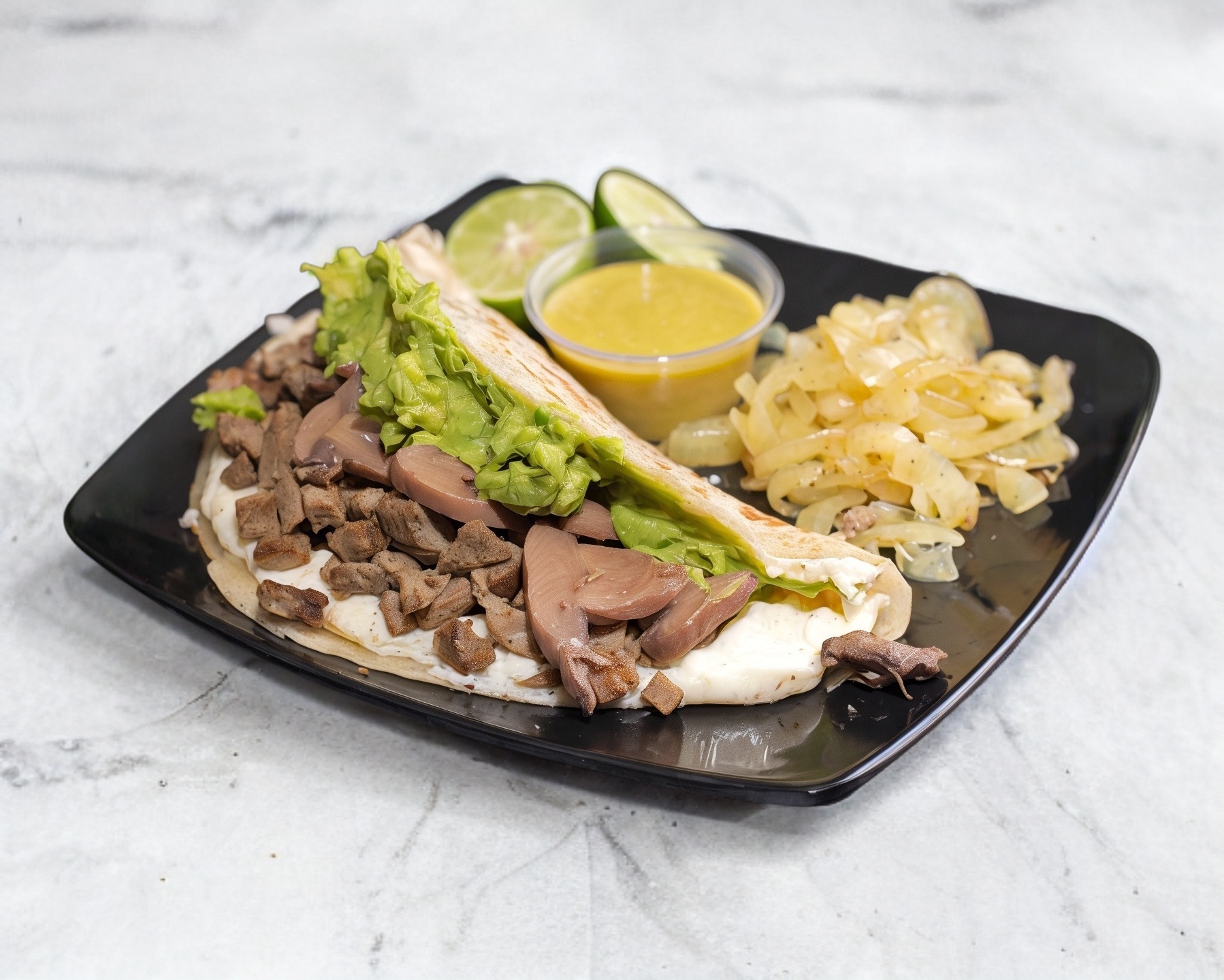 Tortilla grande de harina con queso asadero y carne asada, acompañada de cebolla acitronada.