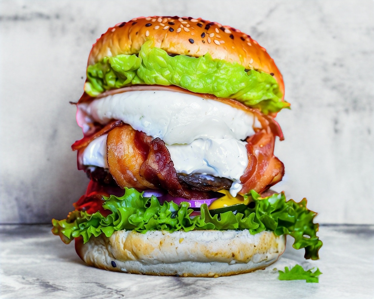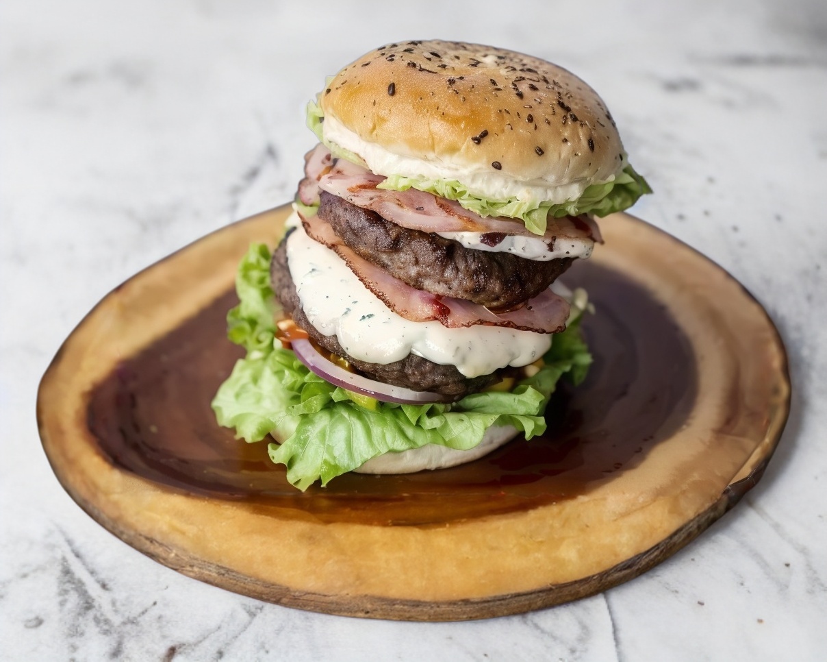 Doble carne casera rellena de queso crema envuelta en tocino, doble jamón, doble queso asadero, guacamole, verduras y aderezos.