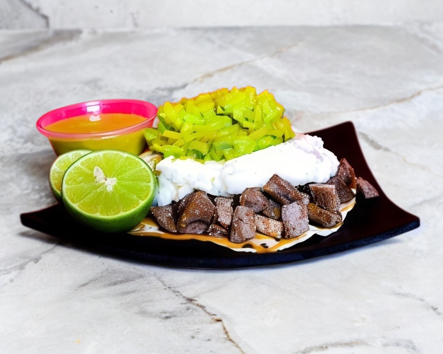 Carne casera acompañada con frijolitos caseros, jamón, queso asadero, guacamole, verduras y aderezos.