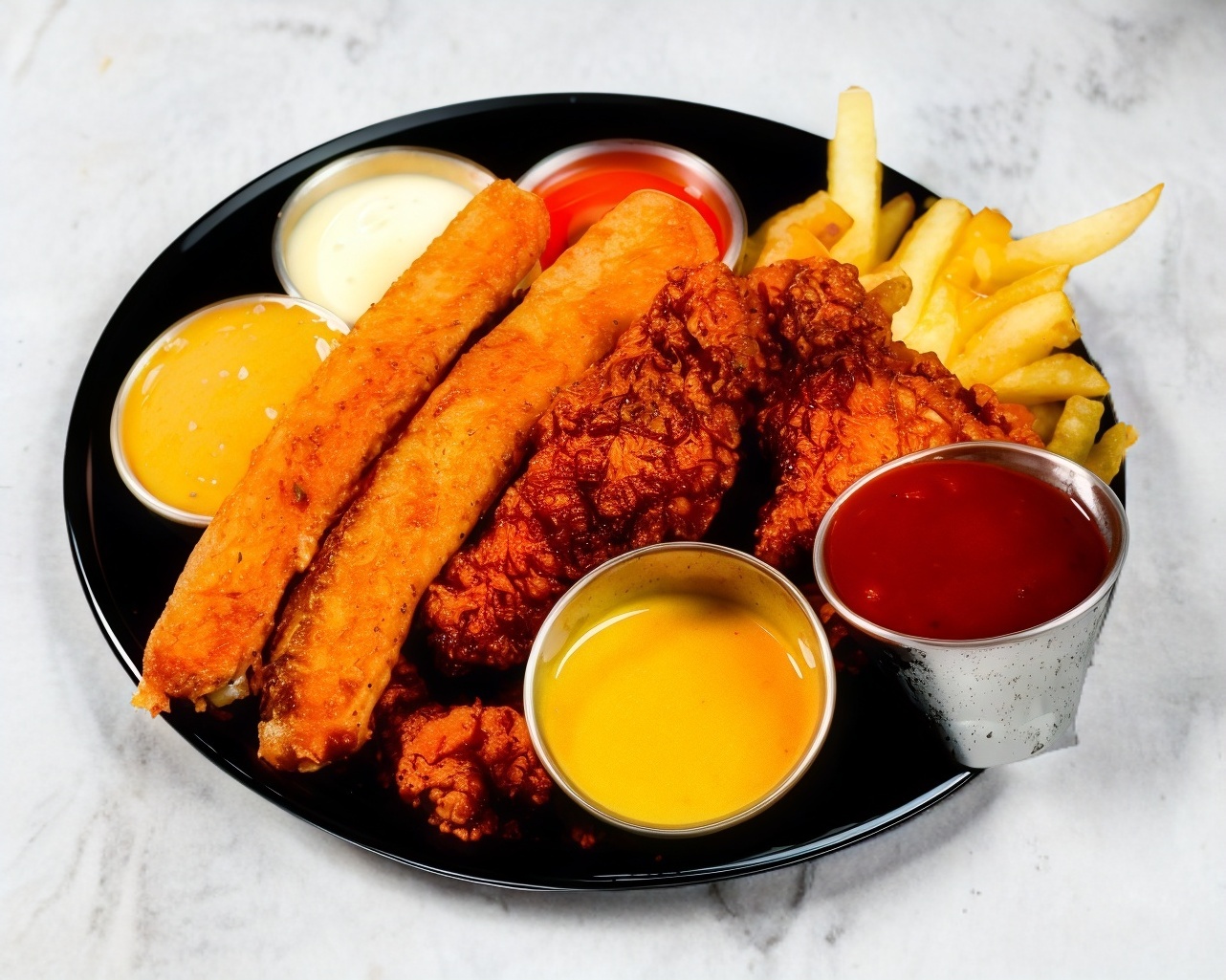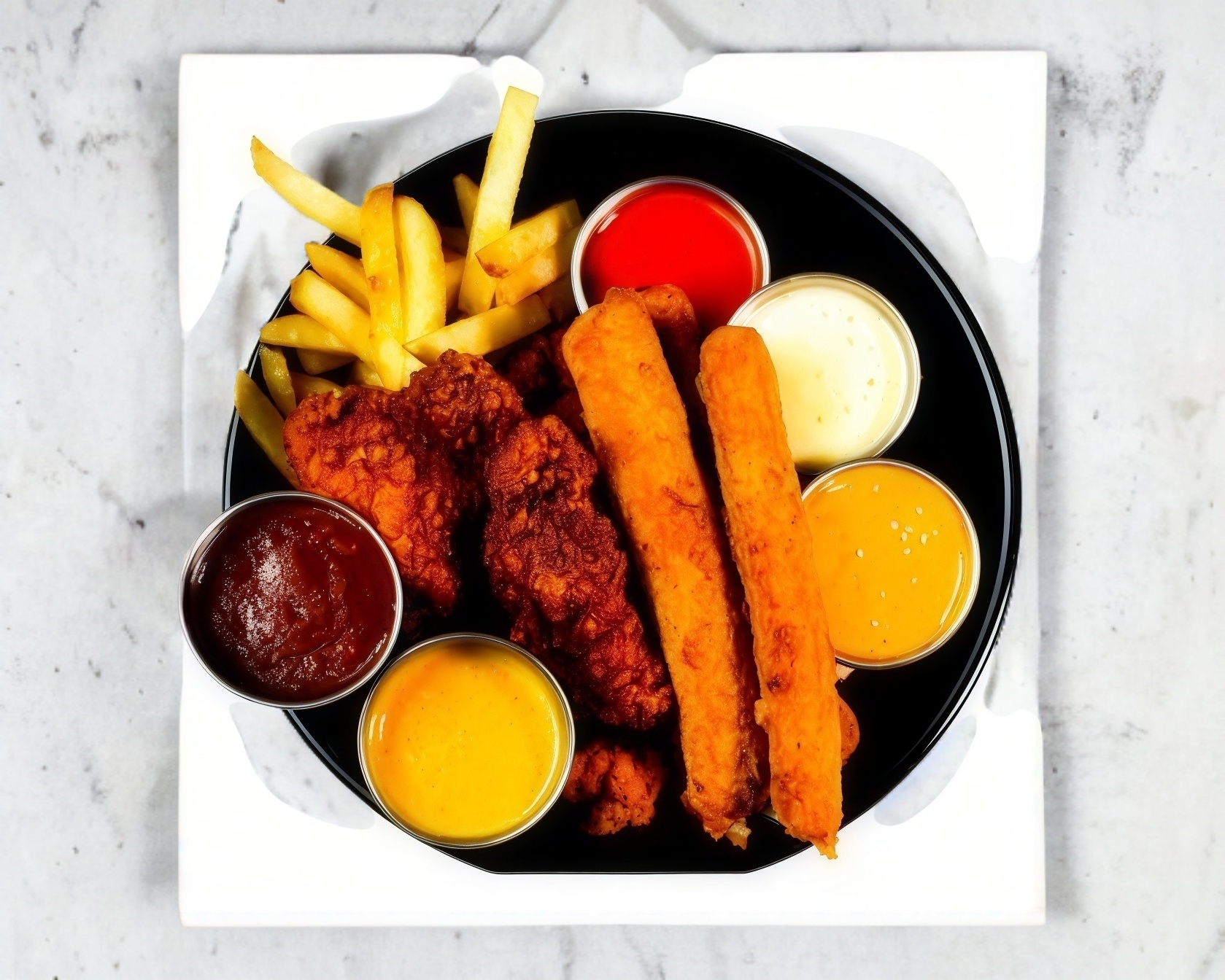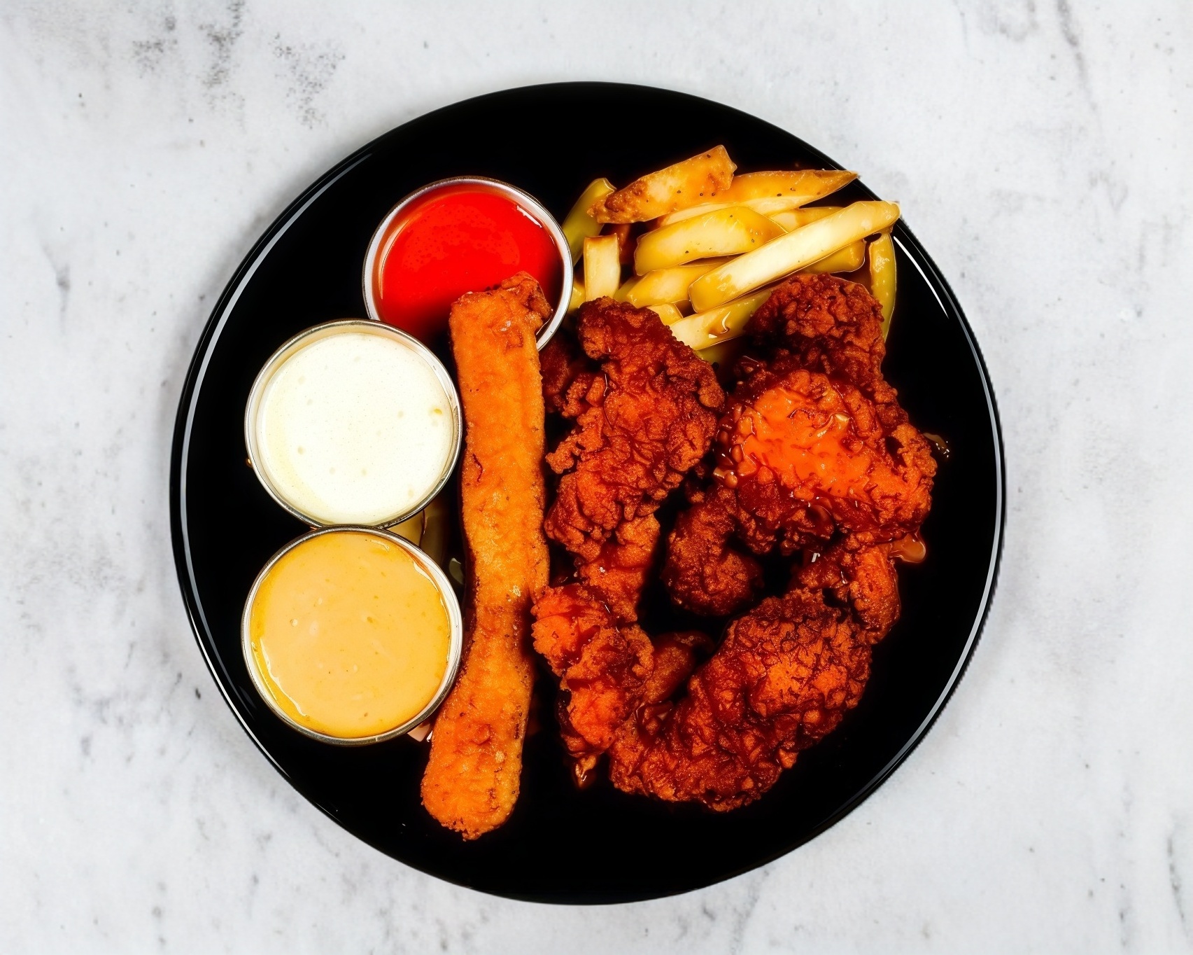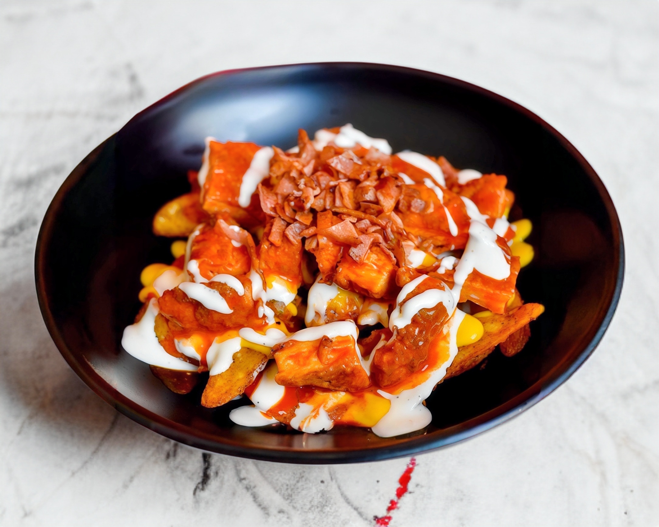 Papas Gajo, tocino, queso cheddar, trozos de pollo empanizado con mucha salsa buffalo y aderezo ranch.