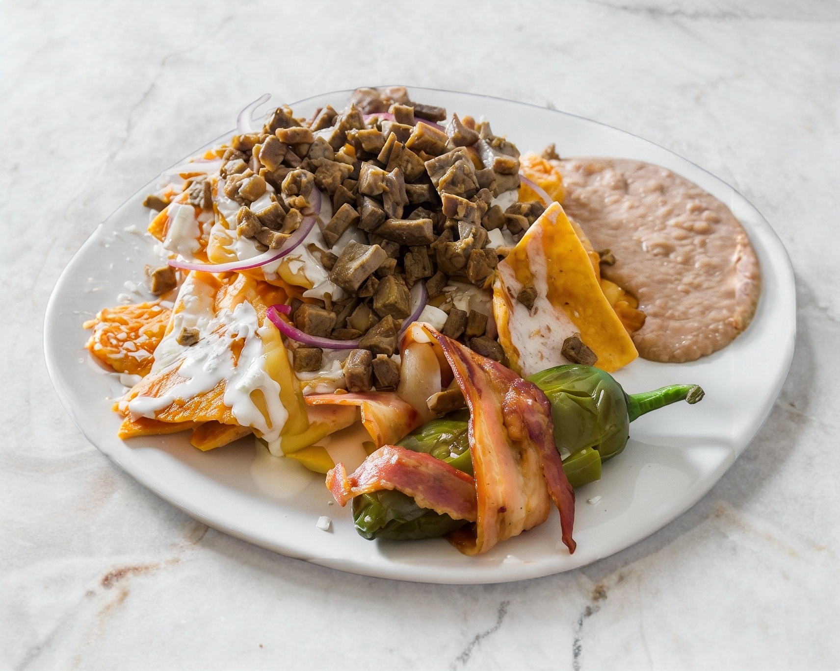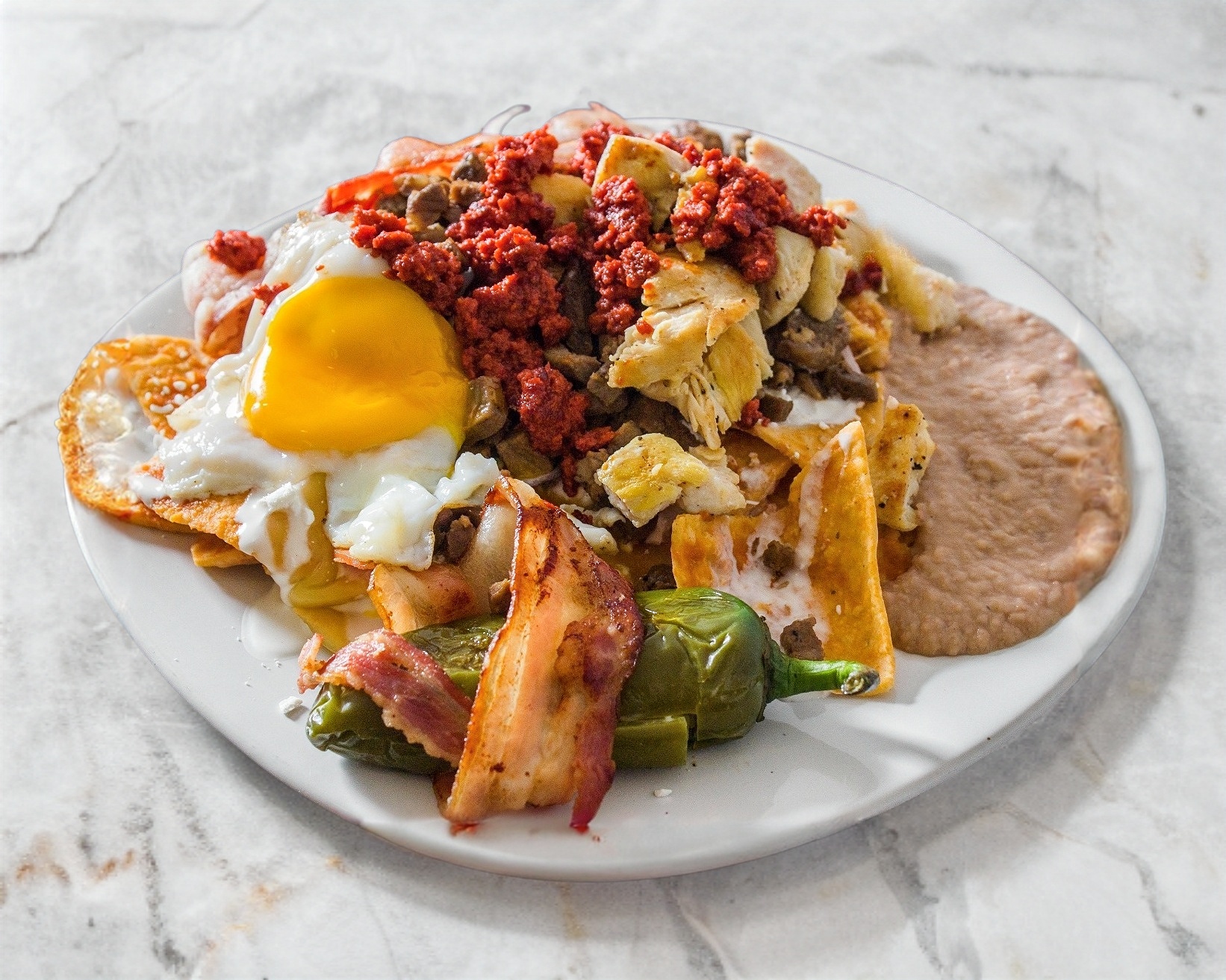 Como los chilaquiles sencillos, mas cuadritos de carne asada, pollo a la plancha, 2 huevos, tocino y chorizo.