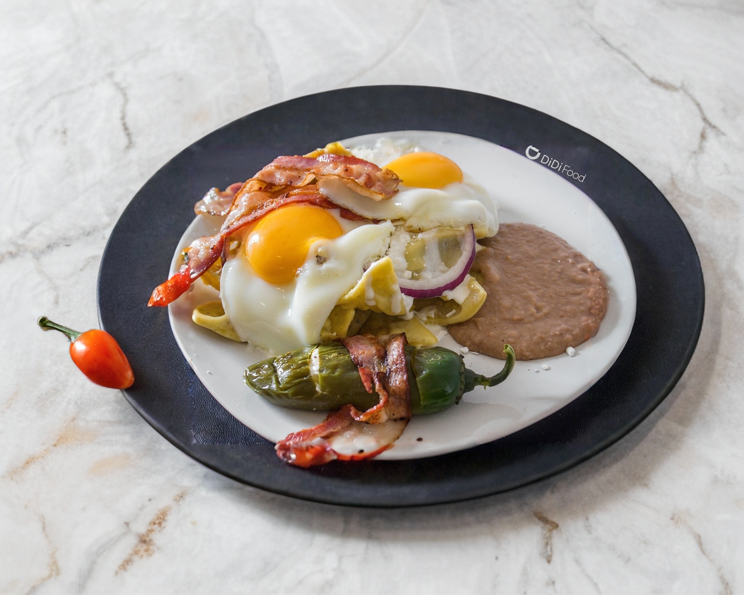 Como los chilaquiles sencillos, mas 2 huevos estrellados y tocino.
