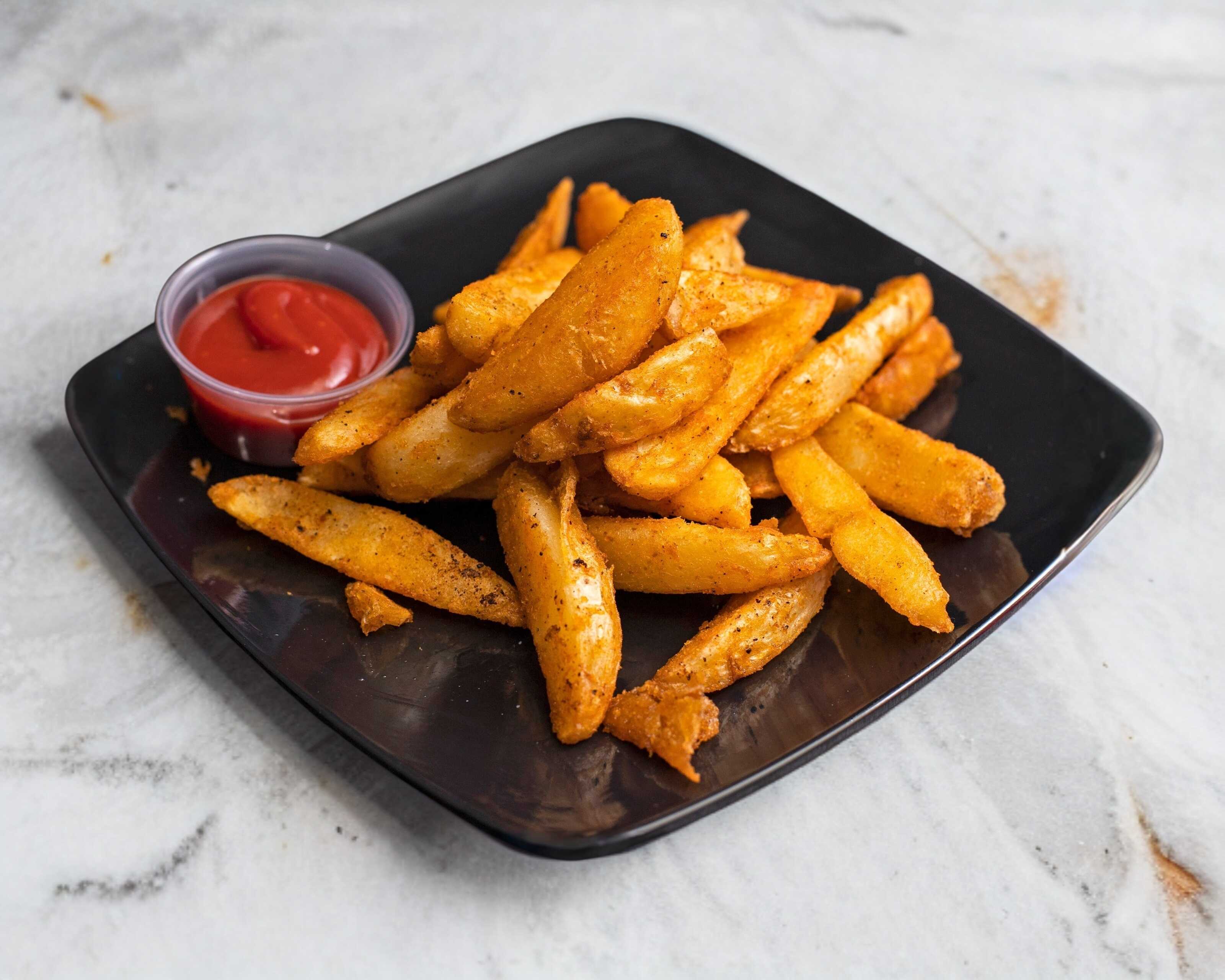 Papas sazonadas en forma de gajo, especiales para acompañar tu hamburguesa.
