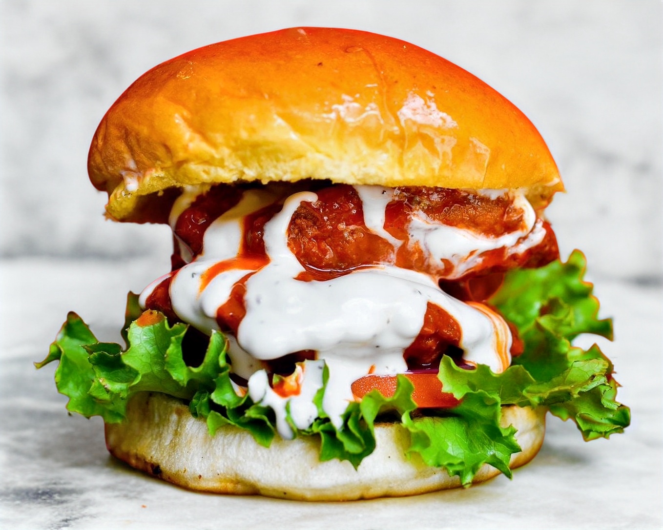 Pan brioche acompañado de un filete de pollo empanizado bañado en salsa buffalo y lineas de aderezo ranch, queso amarillo , verduras y pepinillos