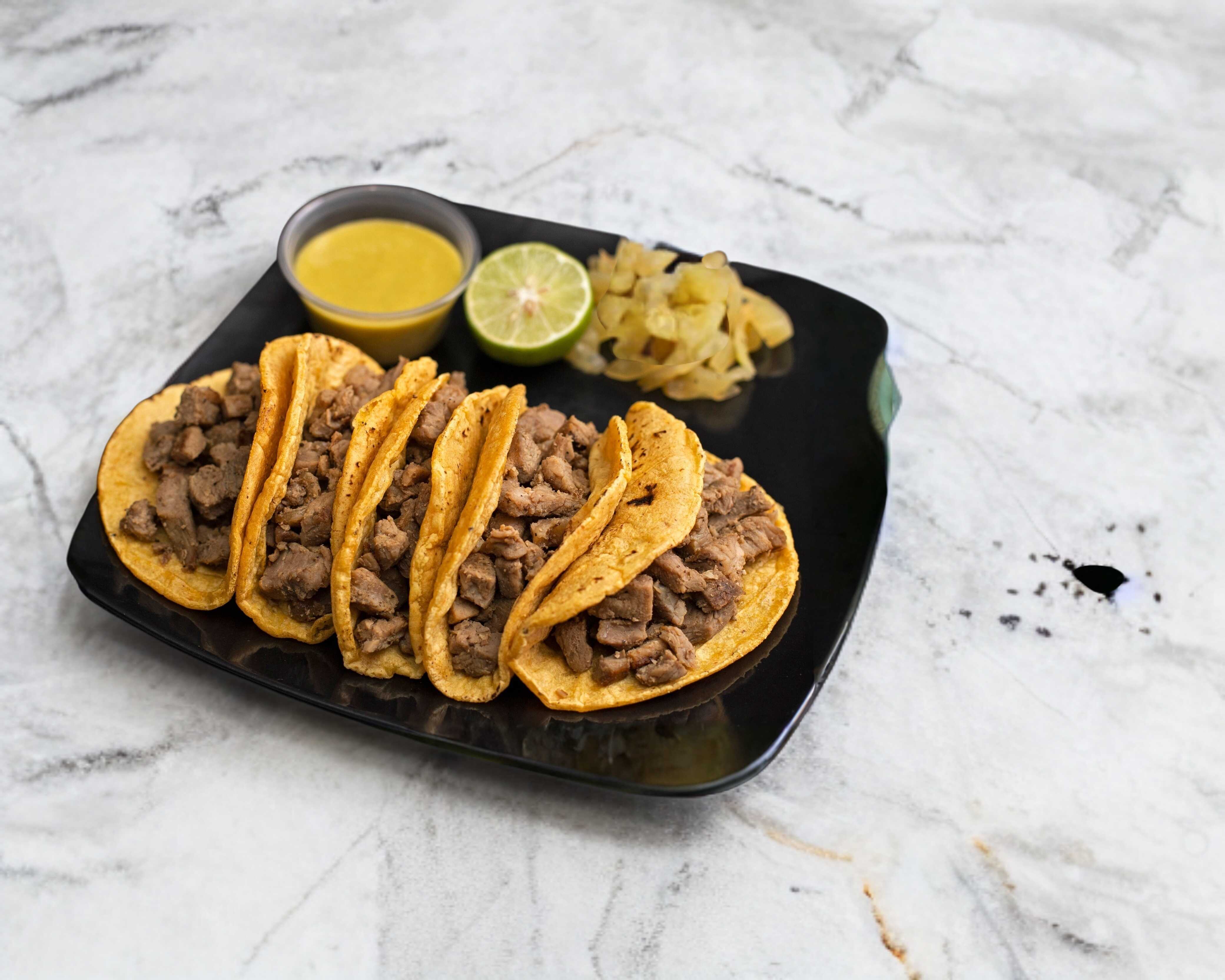 5 tacos de carne asada con cebolla acitronada, limón y salsa.