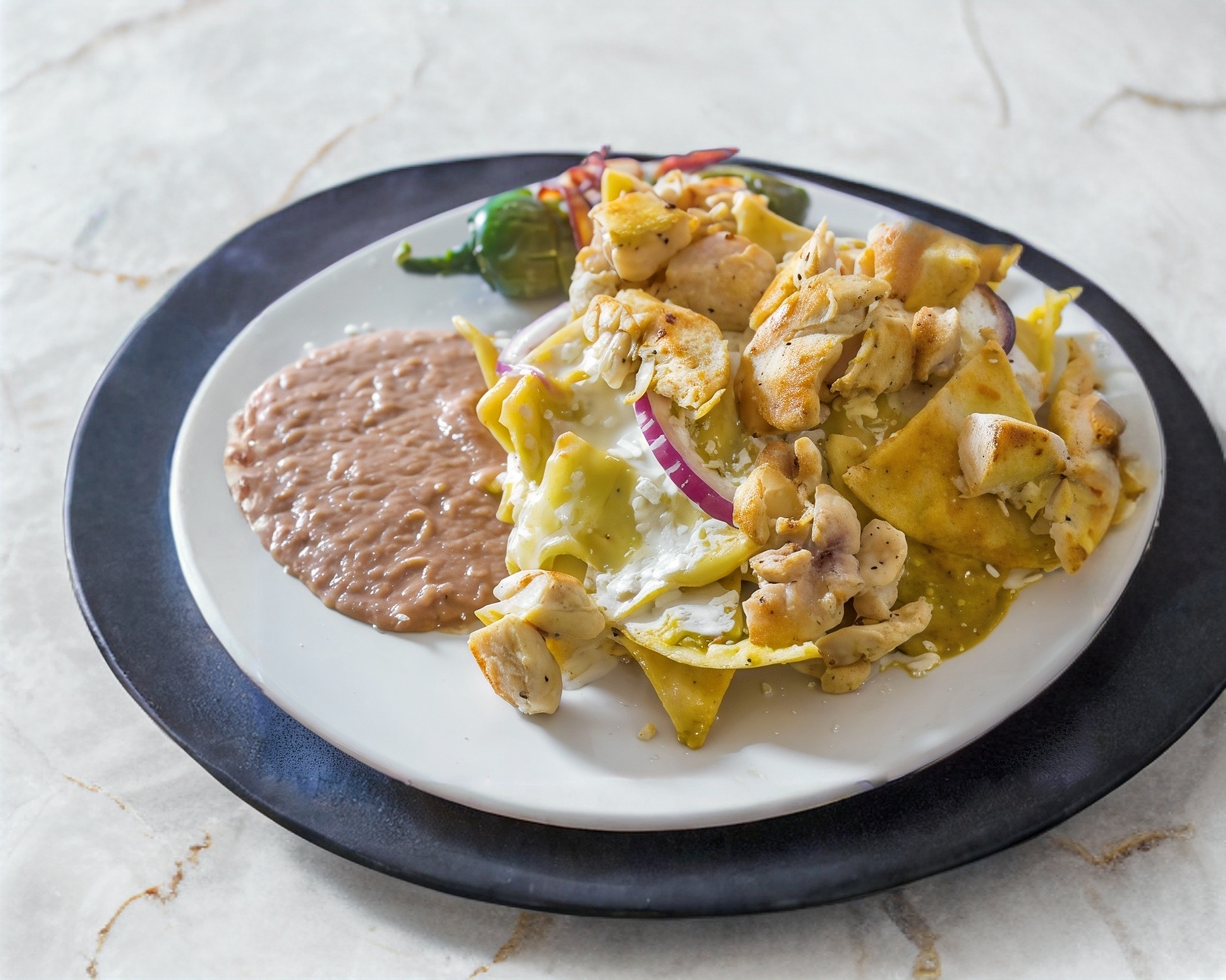 Totopos bañados en salsa a elegir, bañados en queso gouda, queso panela, crema, acompañados de frijoles, cebolla morada, chiles serranos toreados, chiles de árbol y una bolsa de salsa picosa.