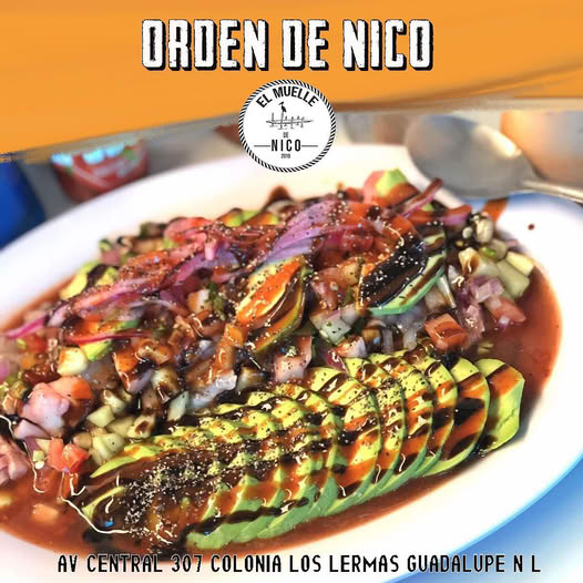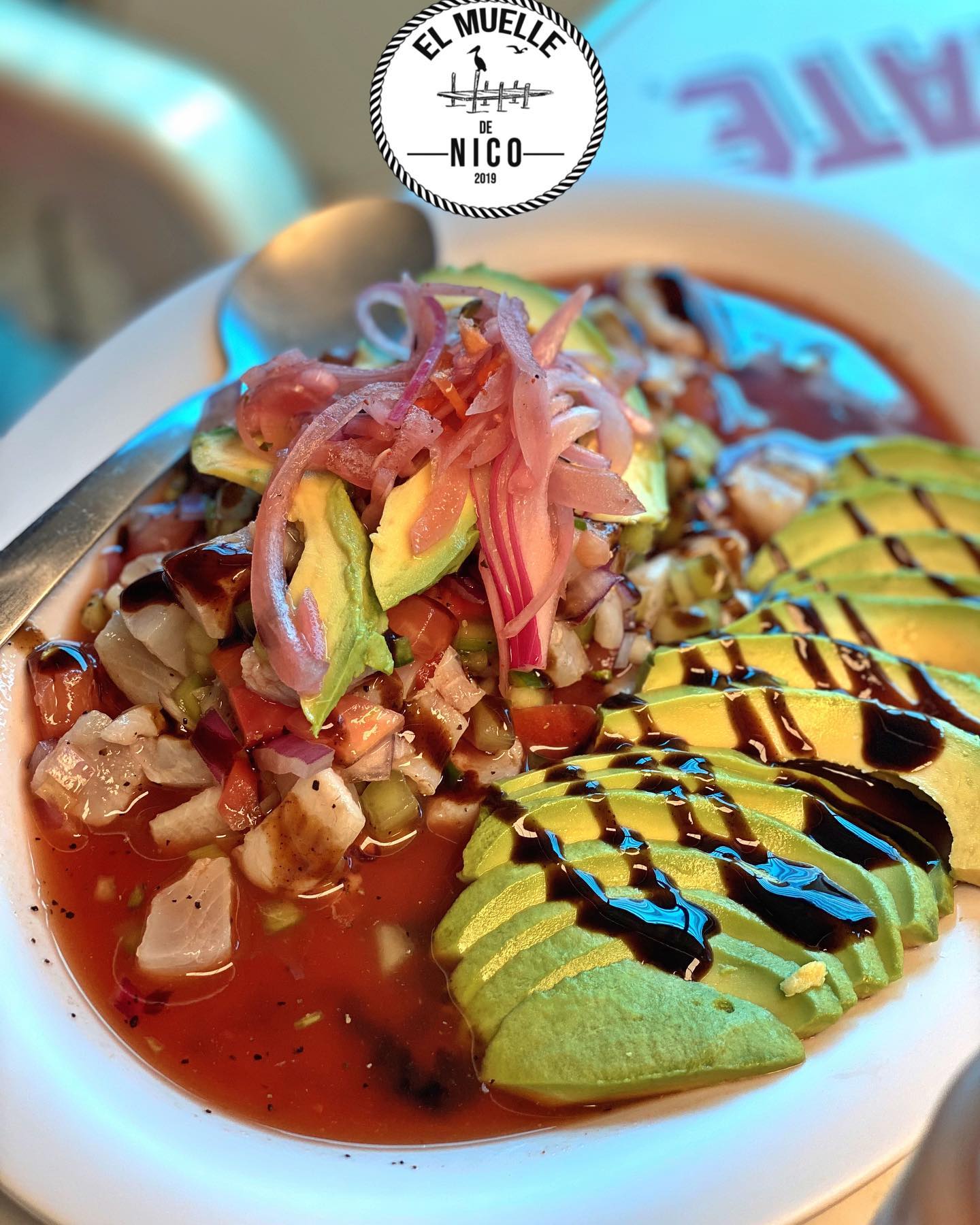 Pescado, camarón, pulpo, salsas de la casa, aguacate, tomate, pepino, cebolla.