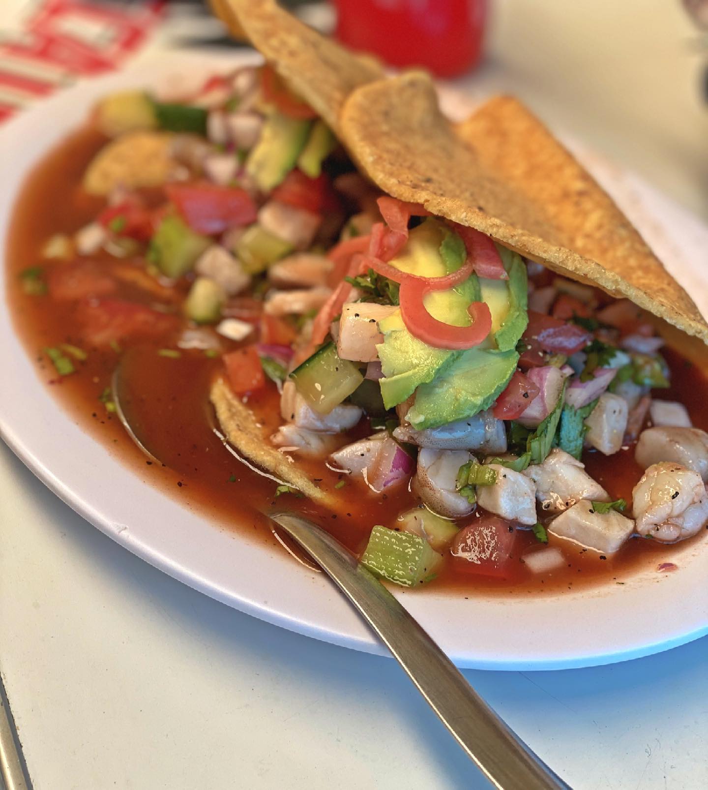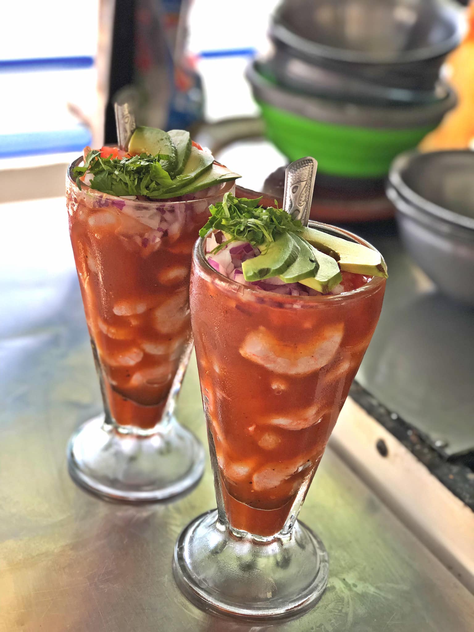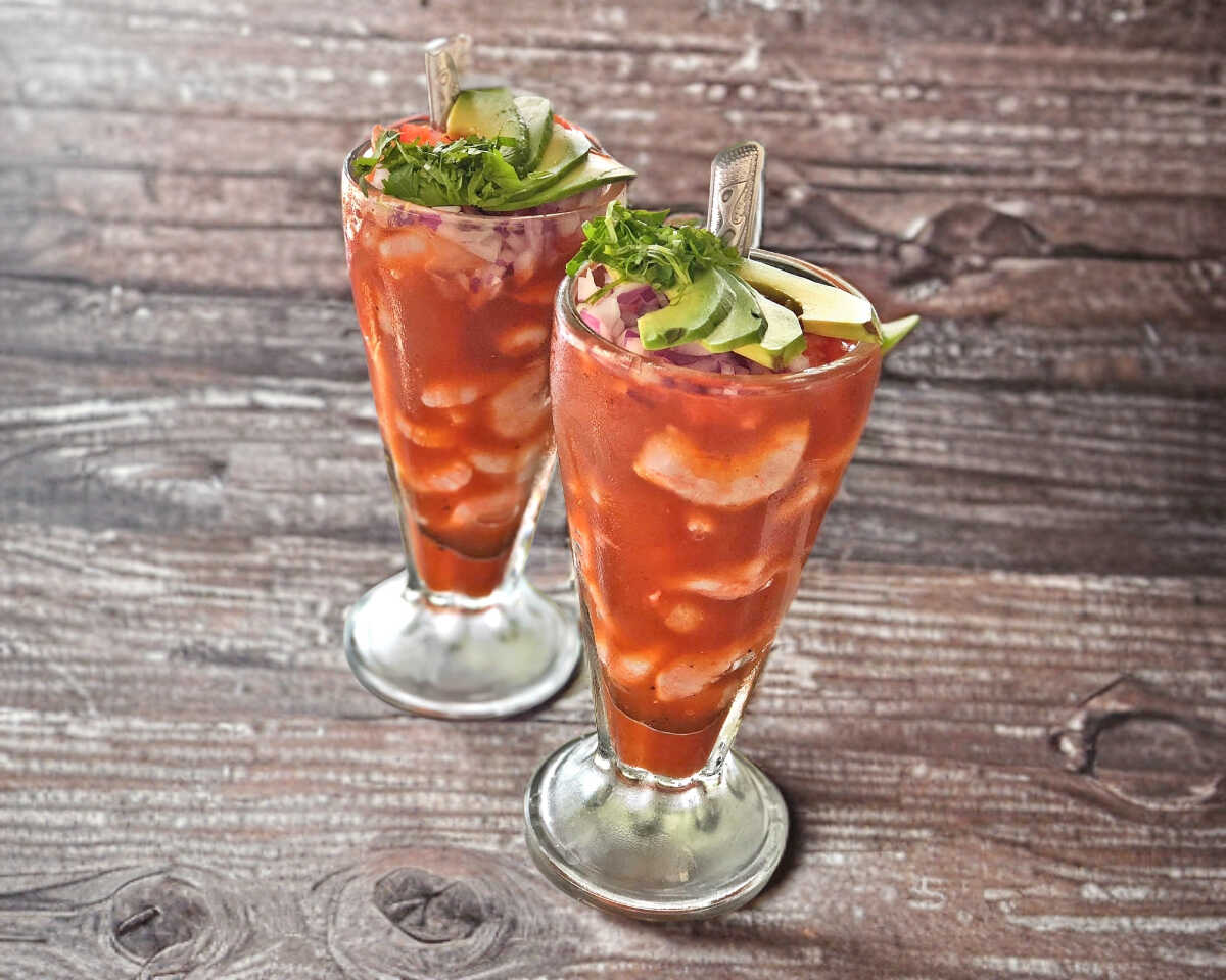 Pepino, cebolla, tomate, aguacate, cilantro, serrano, jugo de almeja.