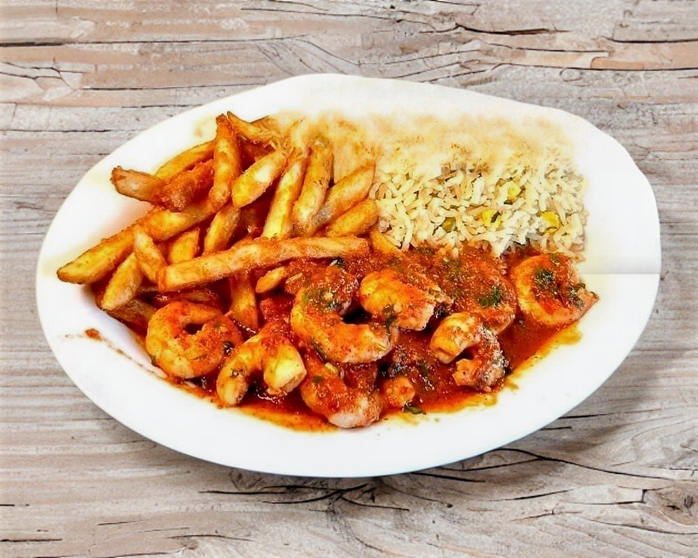 (Plancha, diabla, al mojó, ajillo, encebollado,) arroz, ensalada.