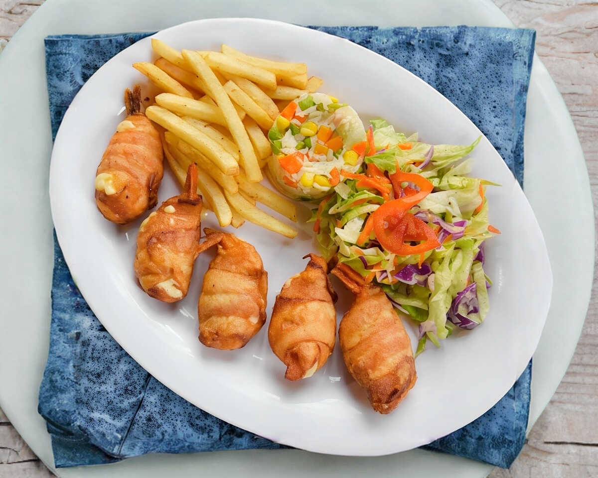 Rellenos de queso y tocino, arroz ensalada y papas.