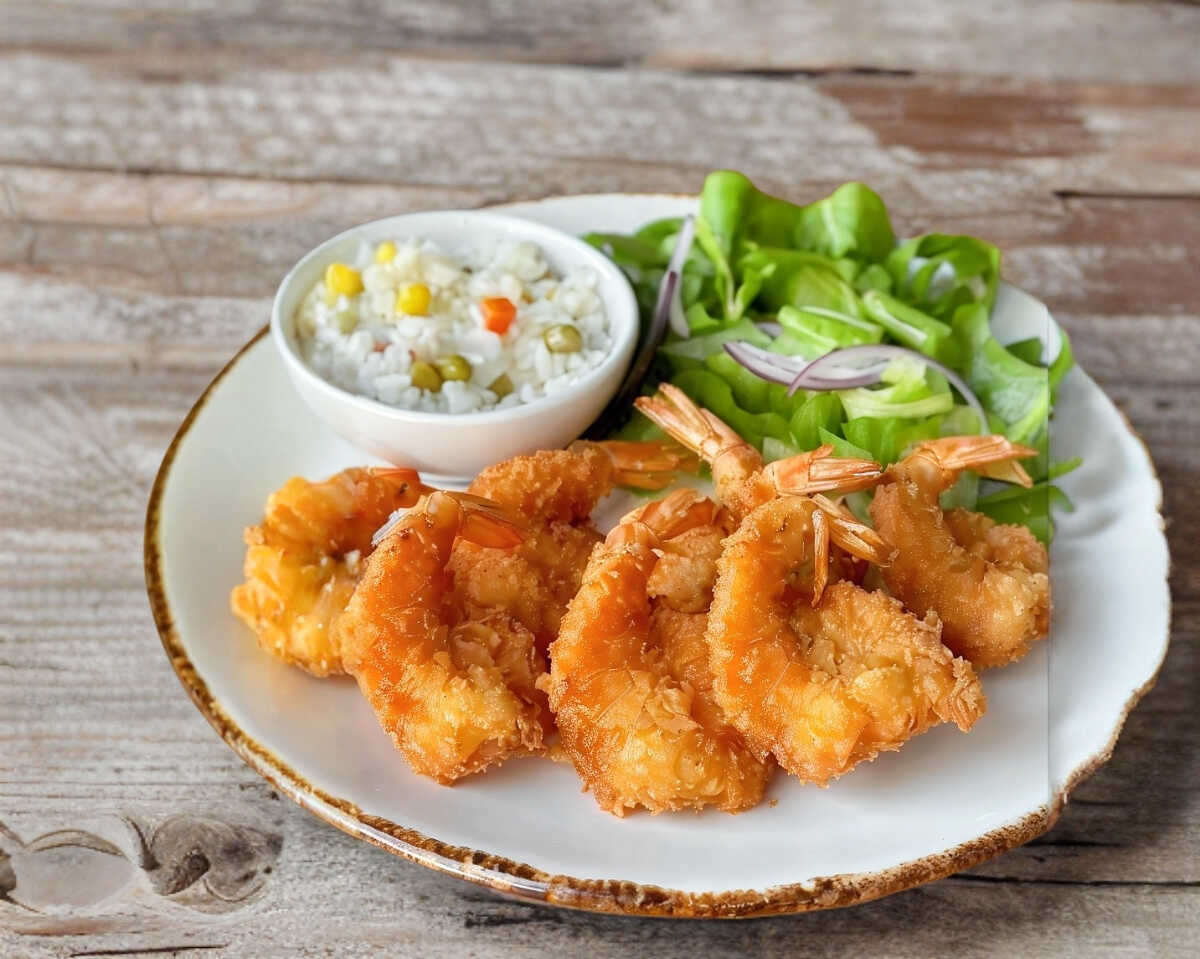 (Chicharrón de camarón), camarón, papas fritas, , ranch y red hot.