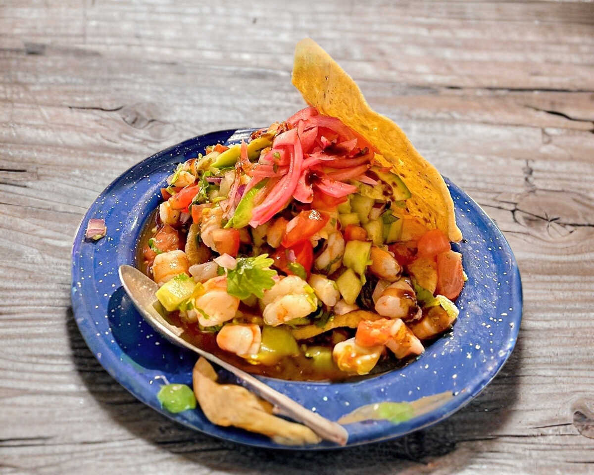 Camarón, tomate, cebolla, serrano, queso, salsa tamarindo.