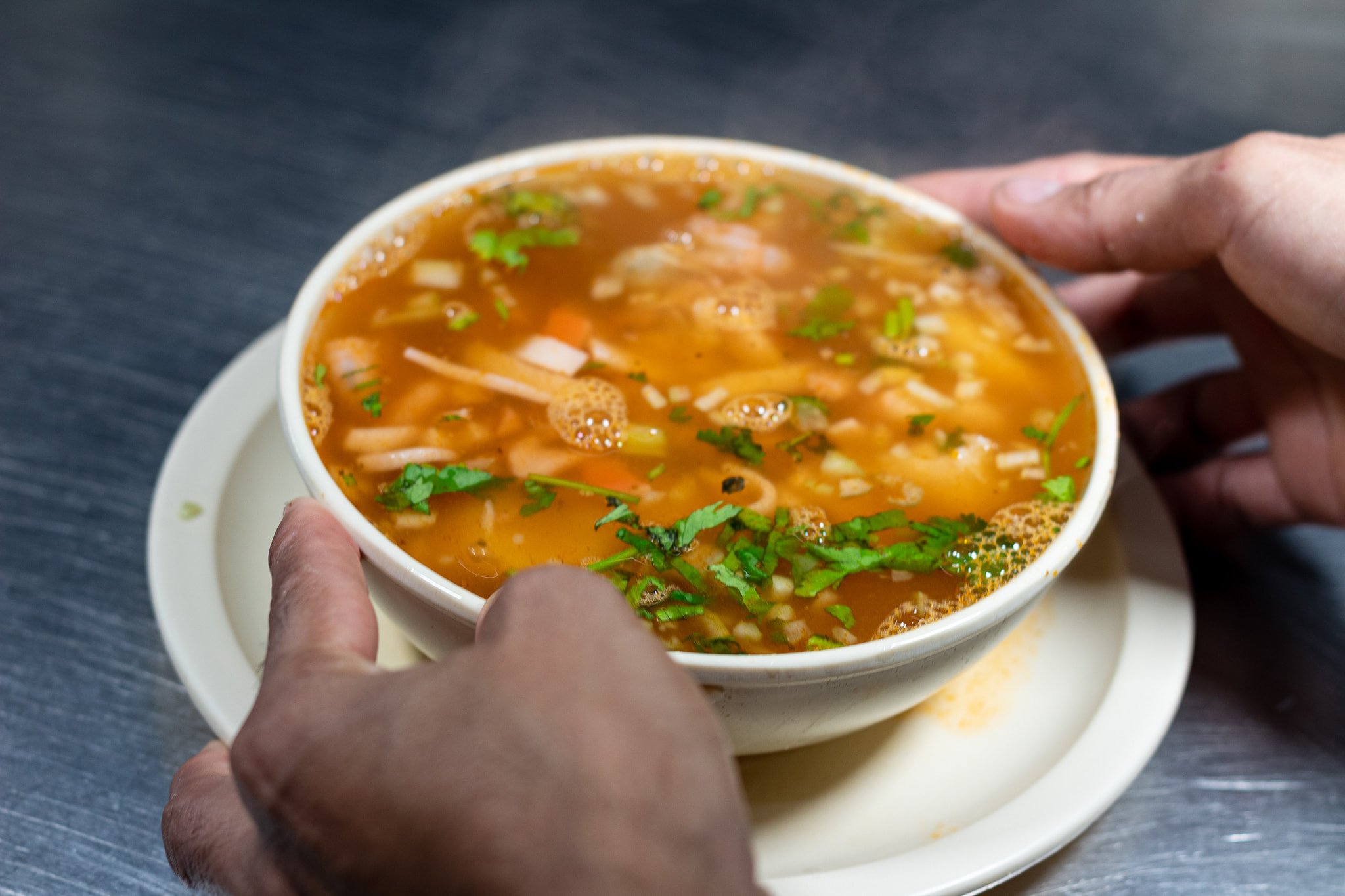 (foto con efecto ilustrativo) UN LITRO CALDO CON CAMARON COCTELERO APIO Y CILANTRO