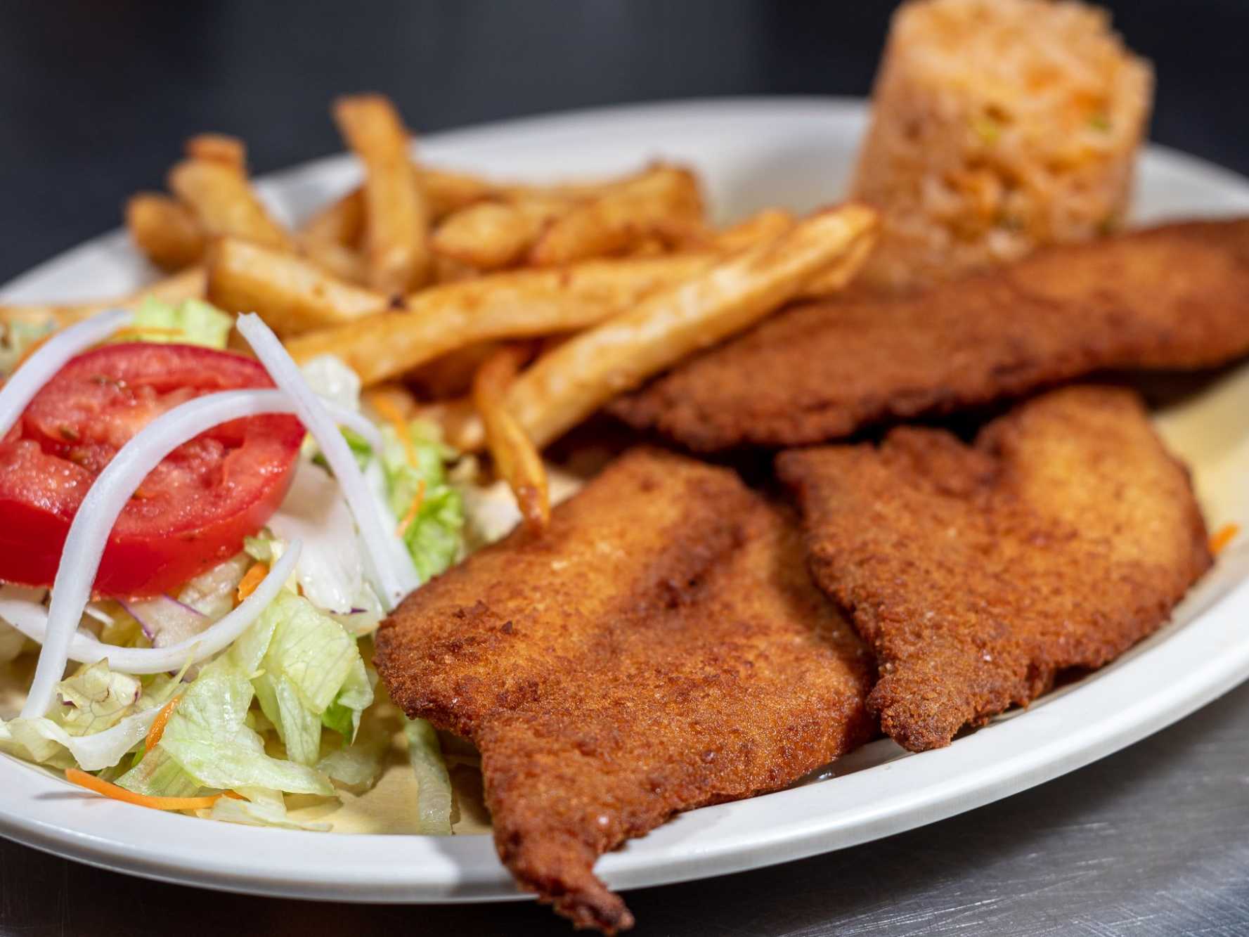 FILETE EMPANIZADO ACOMPAÑADO CON ENSALADA PAPAS A LA FRANCESA Y ARROZ