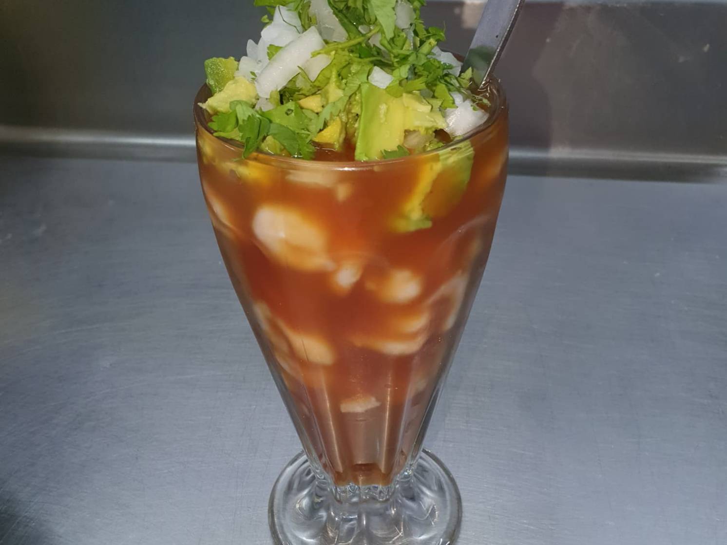 VASO DE LITRO PREPARADO CON CAMARON CATSUP AGUACATE CEBOLLA Y CILANTRO