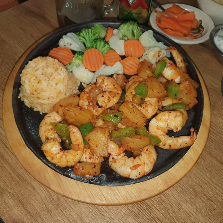 CAMARON GUISADO CON PIMIENTO ORRON,PIÑA CEBOLLA, SALTEADO CON CHILE QUEBRADO, ACOMPAÑADO DE VERDURAS PRECOCIDAS Y ARROZ