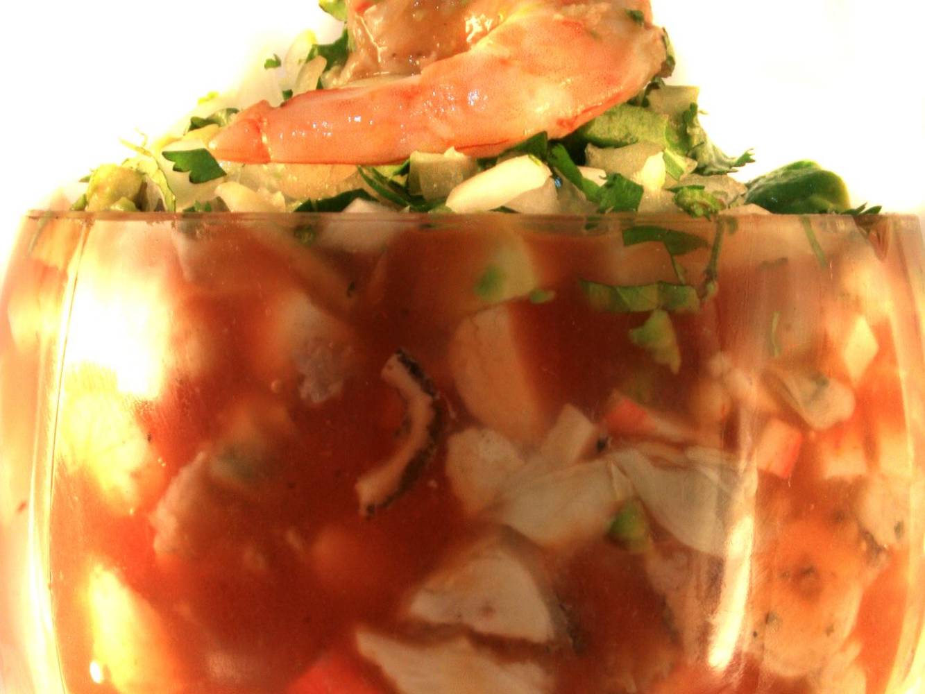 CEVICHE DE CAMARON COCTELERO CON CEBOLLA TOMATE CILANTRO Y AGUACATE