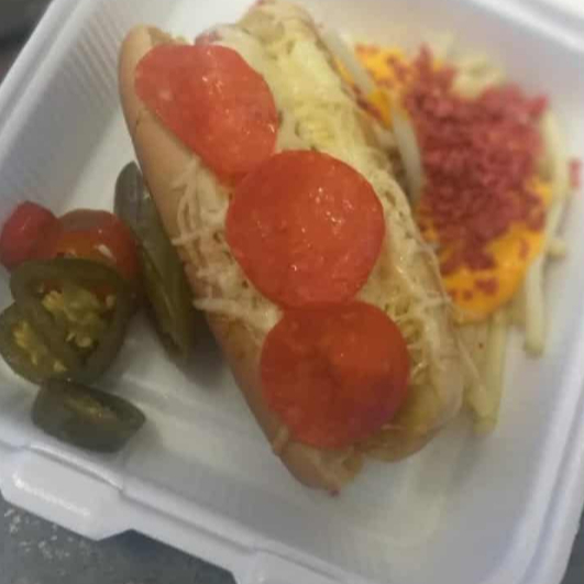 Pan y salchicha jumbo, queso y pepperoni acompañada de papas a la francesa