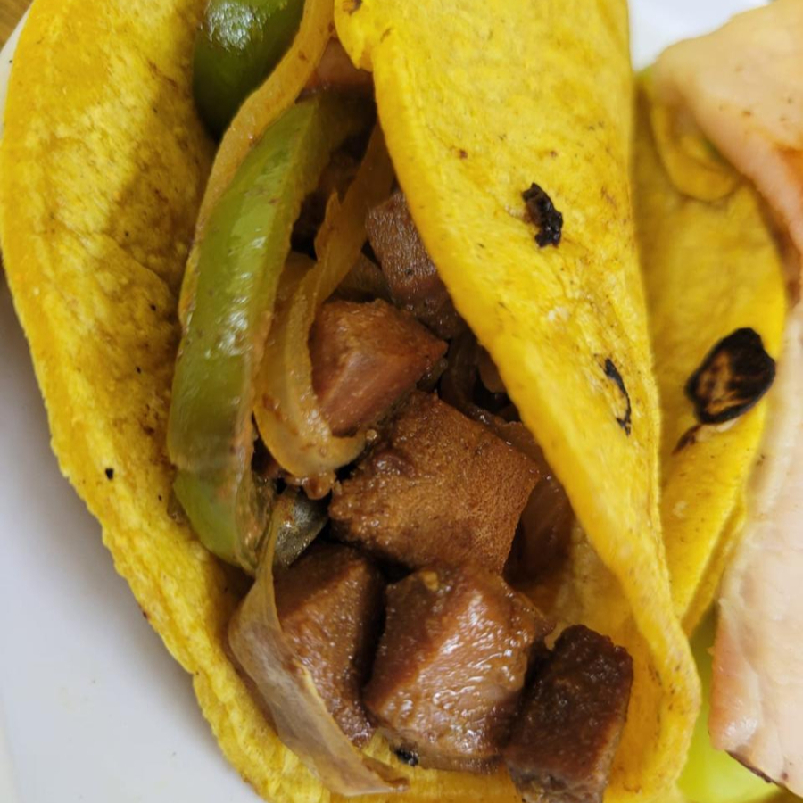 Atún guisado con pimiento verde, cebolla y salsas de la casa