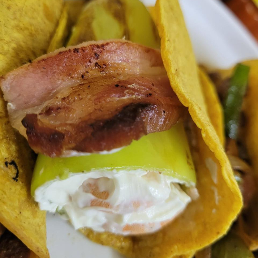 Chile caribe relleno de queso crema, camarón, envuelto en tocino.