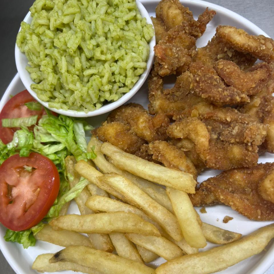 Camarones empanizados acompañados de arroz, verdura y papas a la francesa