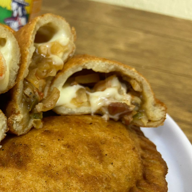Empanada rellena de guiso gobernador y queso acompañado de salsas y aderezo