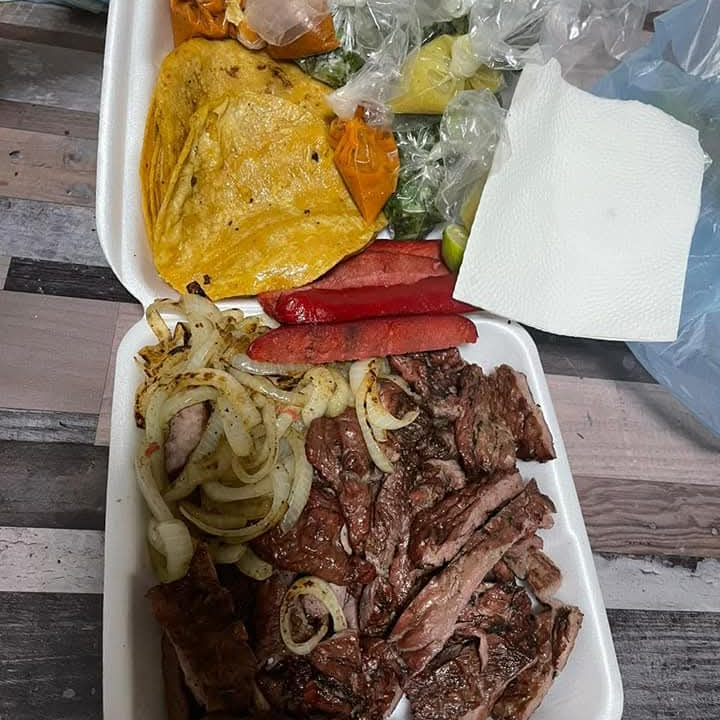 1 kilo de carne de arrachera, 2 salchichas, cebolla asada, 15 tortillas calentadas en manteca, salsas, limones