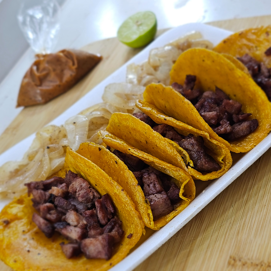 5 tortillas calentadas con manteca, carne de arrachera, limones, salsa y su cebollita asada