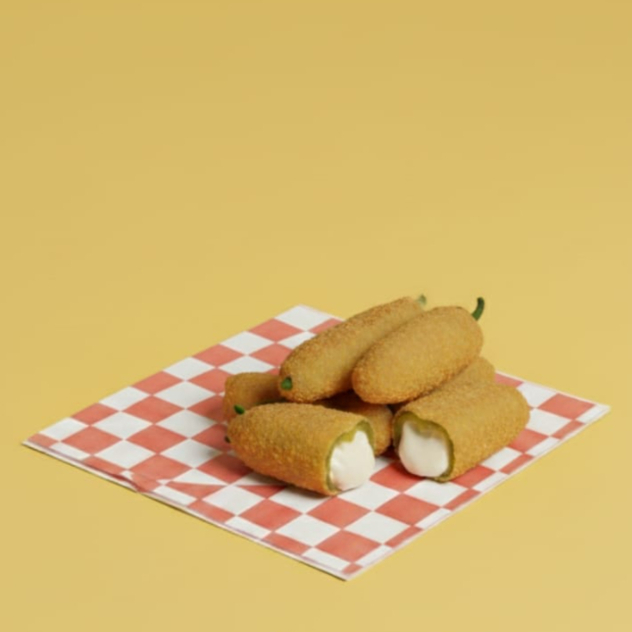 5 pz. de chile jalapeño relleno de queso philadelphia y empanizados.