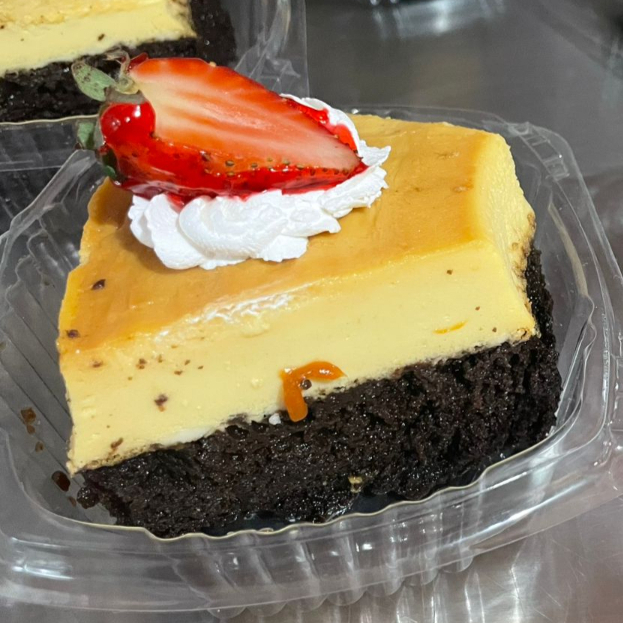 Rebanada de Chocoflan, pan de chocolate con delicioso flan vainilla, decorado con fresa y chantilly.