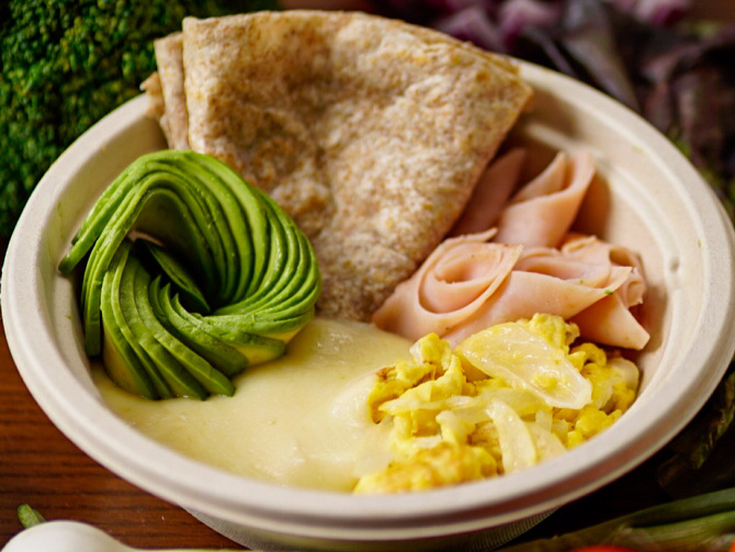 Jamón de pechuga de pavo a la plancha, con huevos revueltos con cebolla salteada, queso chihuahua gratinado, acompañados de aguacate, tortilla integral, salsa roja o verde.