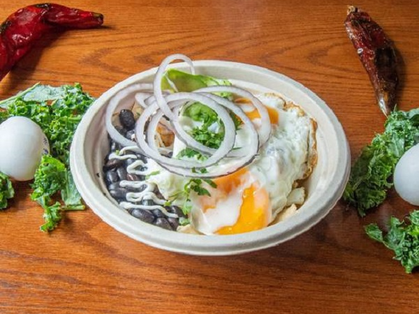 Dos huevos estrellados en salsa roja sobre tortilla chips y frijol negro, acompañado de aguacate, crema, queso y cebolla morada.