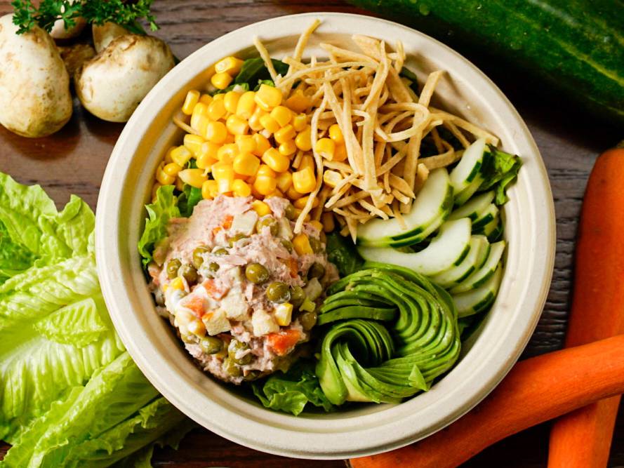 Tuna salad elote, aguacate, pepino, tortilla chips, aderezo jalapeño cilantro y aderezo spicy yogurt.