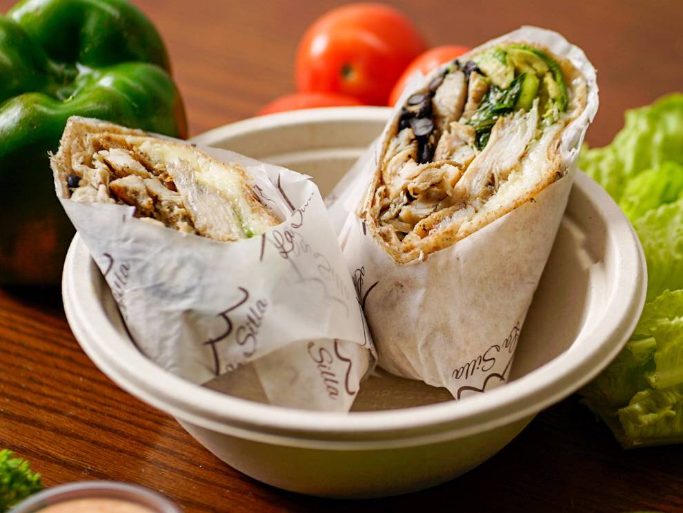 Quesadilla en tortilla de harina integral, pollo, frijol negro, aguacate, aderezo spicy yogurt.