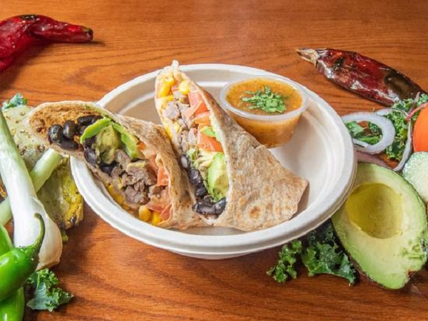Burrito de tortilla de harina integral con jamón de pechuga de pavo a la plancha, con huevos revueltos con cebolla salteada, queso chihuahua y aguacate. Acompañado de salsa roja o verde.