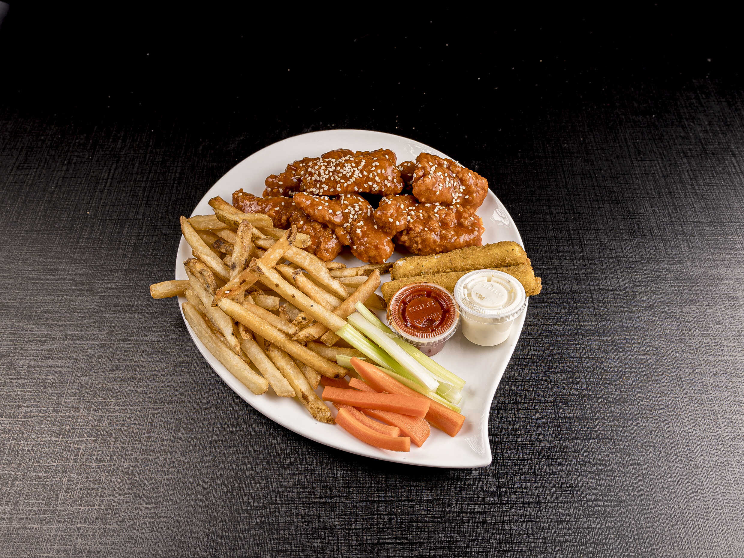 Taste our best Mix!!!!! 280 grms Alitas, 260 grms Boneless, 4 dedos de queso, papas a la francesa, verdura mixta aderezo ranch